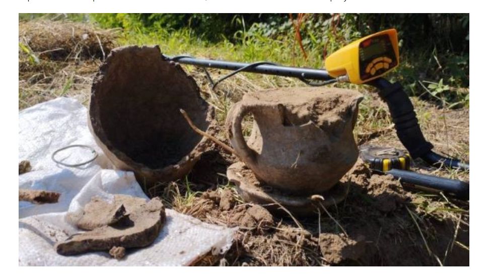 «Кости скелета обнаружены на глубине 140-150 см. Это скорее всего мужчина: у скелета узкий таз при росте 160-170 см. Останки располагалось ровно. При нем не было металлических предметов, даже пуговиц, пряжки ремня, остатков кованой обуви. Был только браслет из медной проволоки, который окислился и изменил цвет. В ногах слева от скелета лежали два глиняных горшка. Один из них сохранился прекрасно, второй частично поврежден», — рассказал Гордеев.