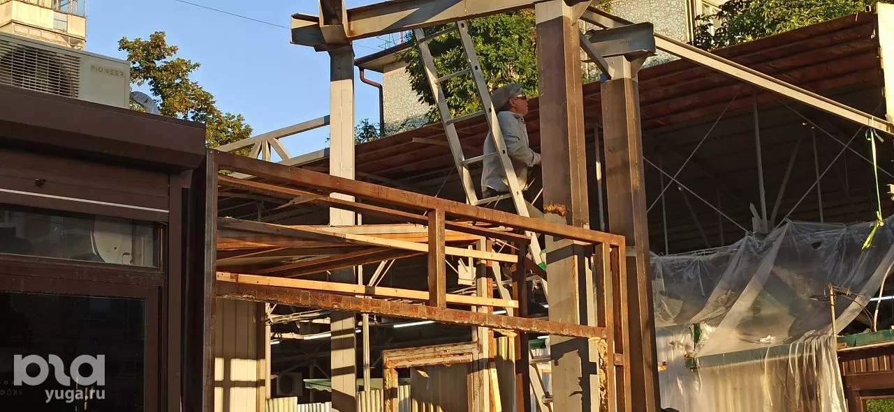 Сейчас на перекрестке улиц Московская и Зиповская заканчивают разбирать торговые павильоны продуктовой ярмарки «Прикубанский курень». Рынок здесь не маленький, на ярмарке 100 торговых мест. Половину из них демонтируют, судьба остальных пока под вопросом. Территория сейчас огорожена красной лентой, но все равно по тротуарам пытаются пройти пешеходы. Хотя прямо над их головой рабочие разбирают кровлю.