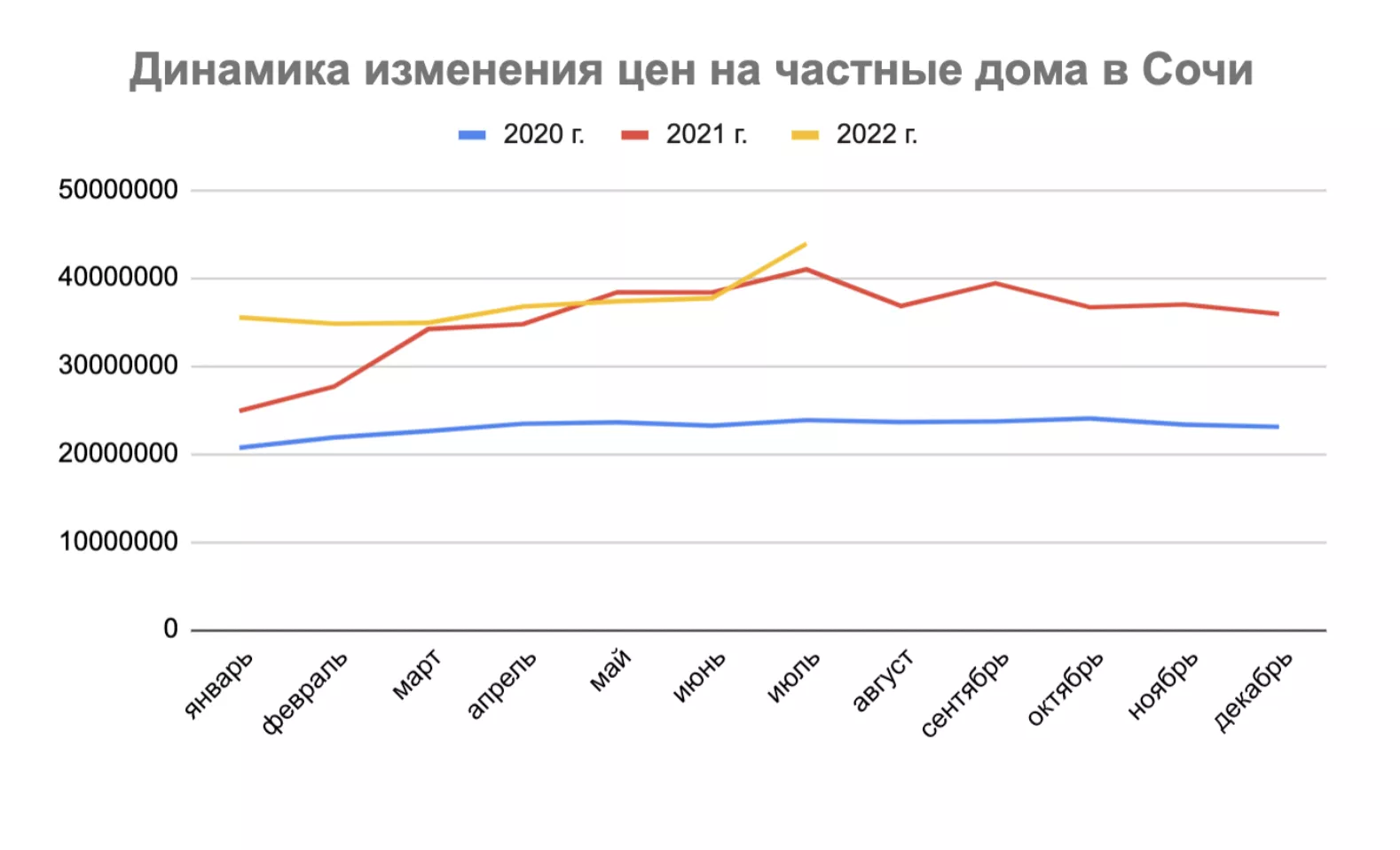 С июля 2021 года по июль 2022 года средняя стоимость частного дома, продающегося в Сочи, выросла на 7,13% или на 2,92 млн рублей. Аналитики «Оникс-недвижимость» пояснили, что во втором полугодии 2021-го средние цены на дома заметно снизились — на 12,38% (5,07 млн рублей).