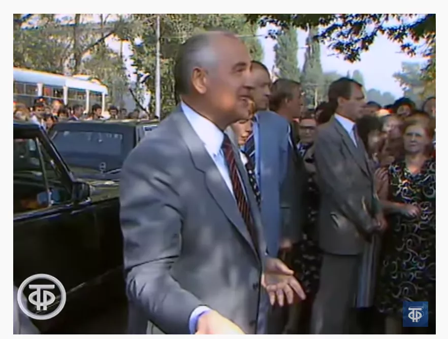 На видео Михаил Сергеевич со свитой стоит на главной площади Краснодара и общается с горожанами. Затем, уже в другой локации, разговаривает с фермерами Кубани. Много говорит о необходимой перестройке государственного аппарата. Из толпы его спрашивают: — «А как же будем перестраивать сознание людей?»