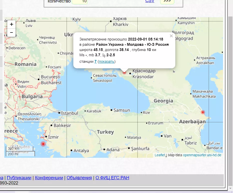 Две недели назад, 20 августа, землетрясение магнитудой 3,3 произошло в 14 км от города Сочи. 25 июля подземные толчки были в районе Армавира, а 16 июня — в Чёрном море в 37 километрах от Анапы.