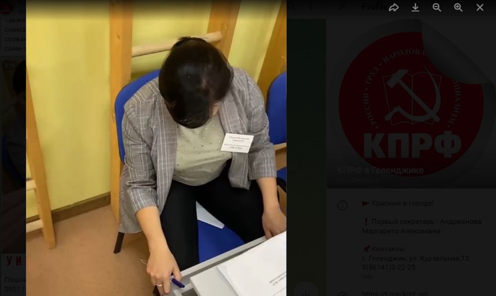 10 сентября телеграм-канал «КПРФ в Геленджике» сообщил о нарушениях на участке № 0901 в детсаду «Берёзка». Очевидцам удалось заснять, как зампред участковой комиссии Марина Тараканова прячет бюллетени с галочками за «Единую Россию».