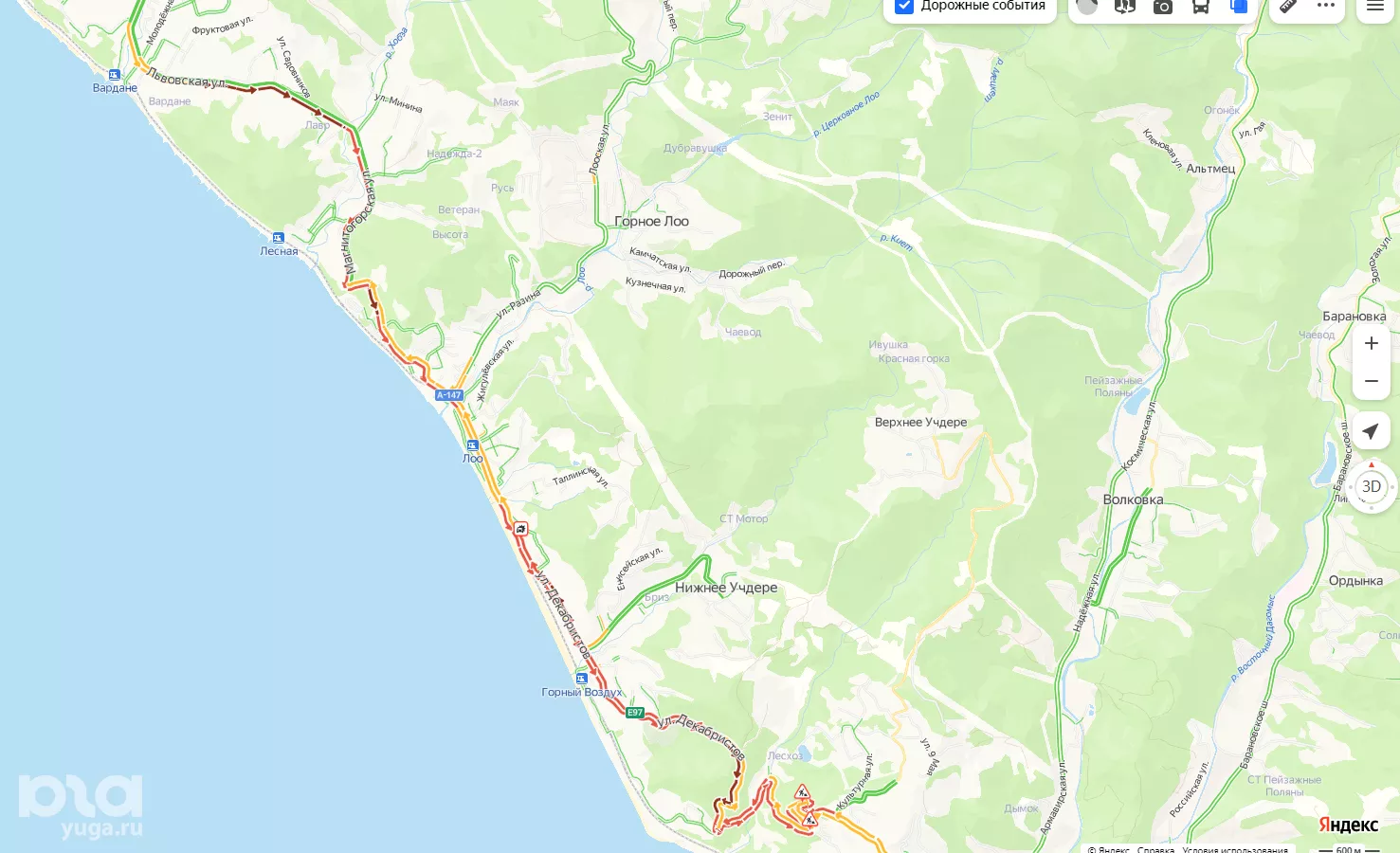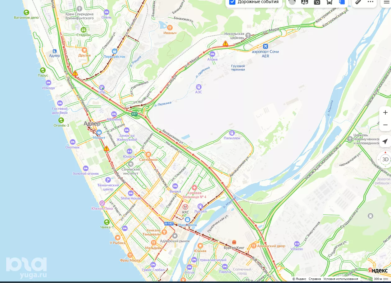 На трассе выстроилась традиционная пробка при въезде в Адлер. Также пробки 9 баллов в районе аэропорта и на прилегающих к нему улицах. После резонансного случая летом, когда из-за пробок группа туристов опоздала на рейс, в аэропорту Сочи рекомендовали закладывать больше времени на дорогу к аэровокзалу.