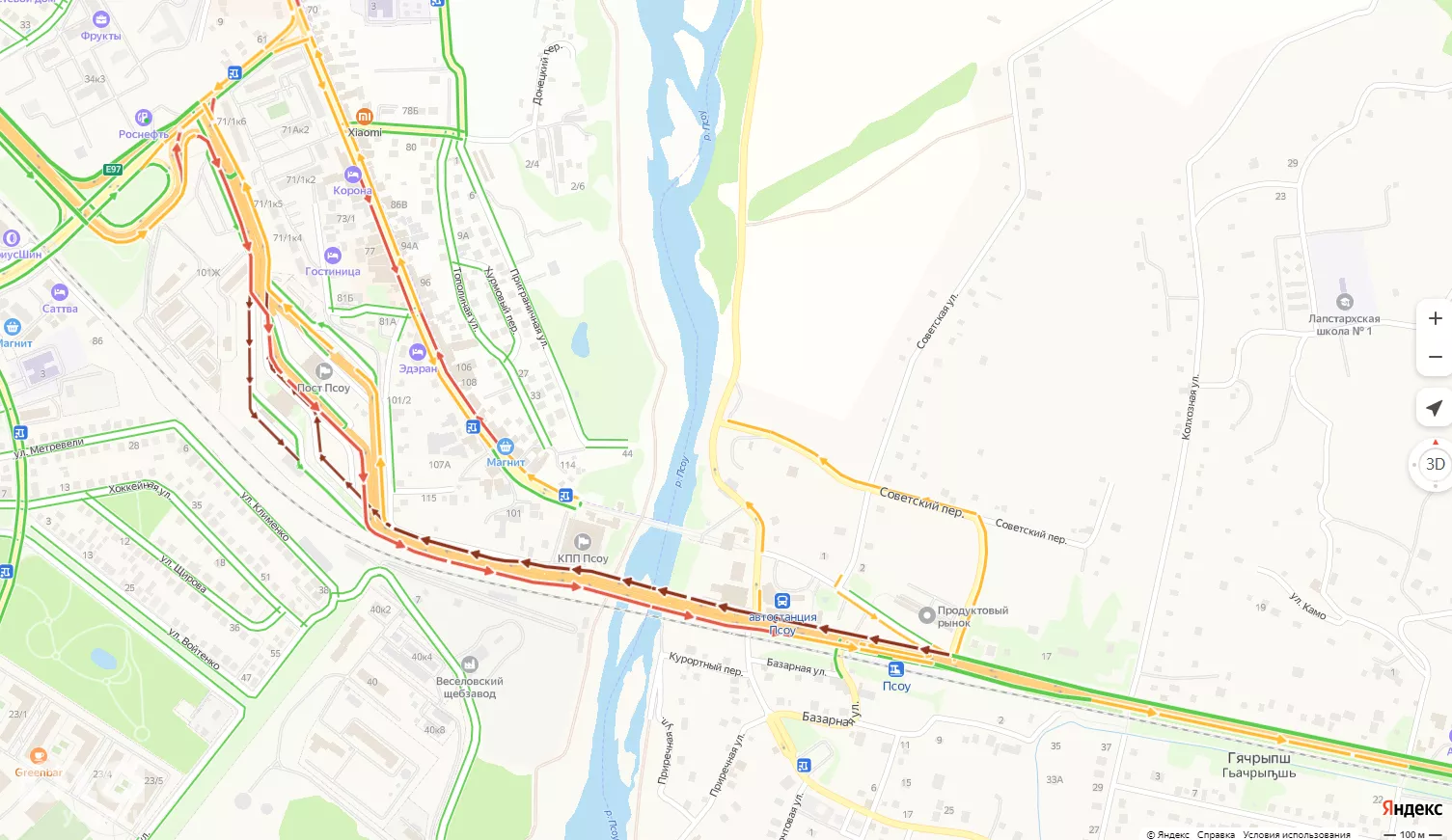 В целом по городу днём и вечером были пробки на улице Горького, на Курортном проспекте, на Донской и на Транспортной. Очередь из автомобилей выстроилась в сторону Абхазии. На пропускном пункте в Псоу собралась пробка в 9 баллов. Автомобильная вереница в 10 баллов выстроилась в сторону Адлера.