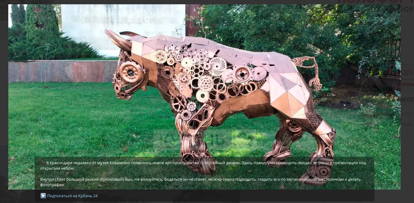 Там уже появился первый арт-объект — большой бронзовый бык, созданный из индустриального мусора. «Музейный дворик» находится в Краснодаре по адресу улица Красная, 11.