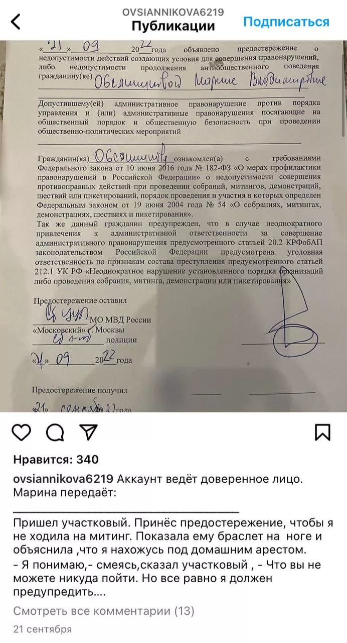 21-го сентября, в день объявления частичной мобилизации, полиция предостерегала Овсянникову от возможного участия в митингах. Информацию об этом с фотографиями документа она выложила в соцсетях.