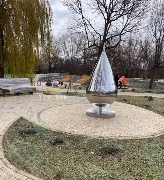 Скульптуру купили в магазине арт-объектов «Симметрия». Высота «Капли» составляет 2 метра 20 сантиметров, сделана она из нержавеющей стали.
