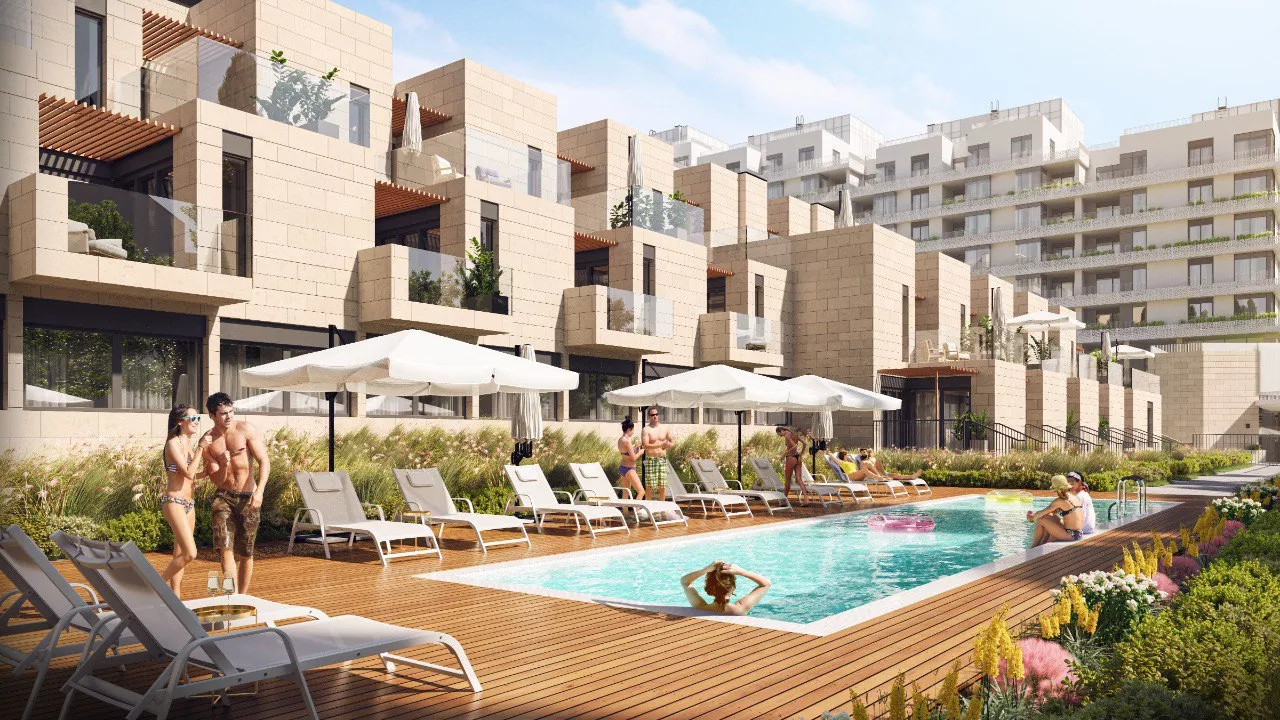 У резиденции особенный ландшафт — двор состоит из нескольких террас, которые каскадом спускаются в сторону набережной. На четырех уровнях разместятся жилые корпуса разной этажности с премиальными резиденциями и пентхаусами, а также редкие форматы квартир. Например, трехуровневые квартиры с подземным этажом, где можно обустроить винный погреб или комнату отдыха. Также здесь предусмотрен двор с авторским озеленением, панорамный инфинити-бассейн с прозрачной внешней стеной, игровые площадки и воркаут-зона.