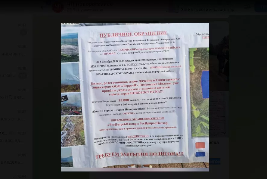 В публичном обращении председателю СК РФ Бастрыкину и председателю правительства Мишустину говорится, что расширение свалки в Борисовке — это провал мусорной реформы Краснодарского края. Новороссийцы просят до 8 декабря провести проверку расширения мусорного полигона.
