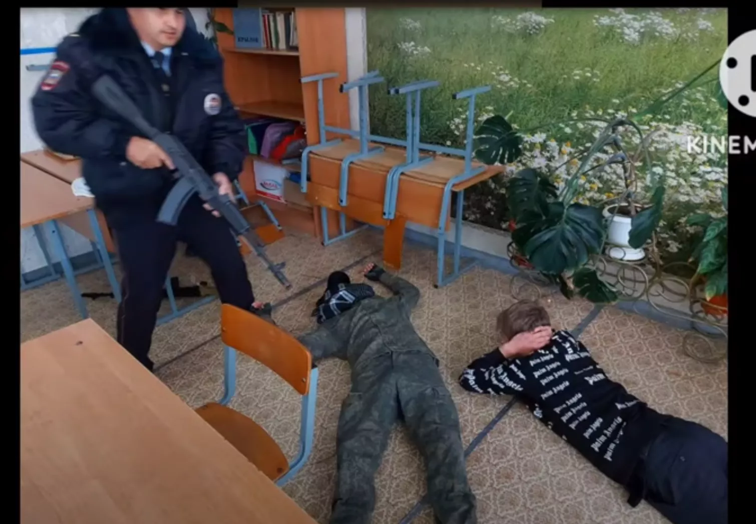 На видео видно, как в класс врываются люди с закрытыми лицами и в камуфляже, целятся в учеников из автоматов и сгоняют их к окну, грубо выкрикивая команды: «Руки за голову! Встать к окну! Быстро!». Также Емельянова опубликовала несколько фото: на одном учащиеся лежат на полу, держа руки на затылке, на другом — человек в камуфляже наводит на школьников оружие или муляж, на третьем — взрослый мужчина в полицейской форме направляет автомат на детей, лежащих на полу. Также есть групповое фото, где учащиеся, учителя и «террористы» дружно стоят у доски, видимо, после успешного завершения учений.