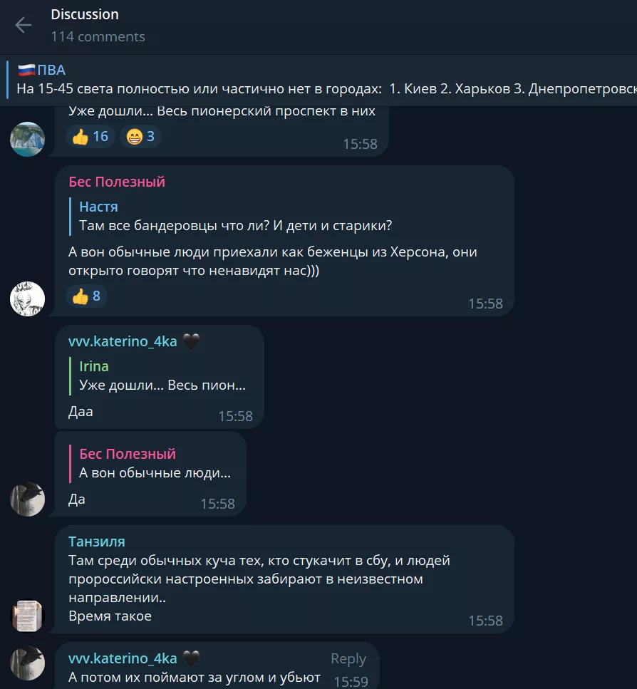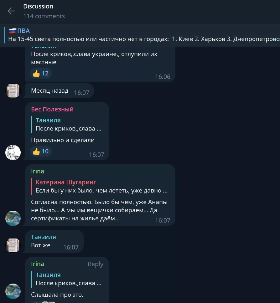 Заметив всплеск интереса к теме, редакция нашла комментарии о конфликте в телеграм-канале ПВА под постом об отключении света в Украине. Также мы нашли аудиосообщение, многократно пересланное в WhatsApp. И там, и там упоминалась драка между «местными» и мигрантами, «орущими «Слава Украине».
