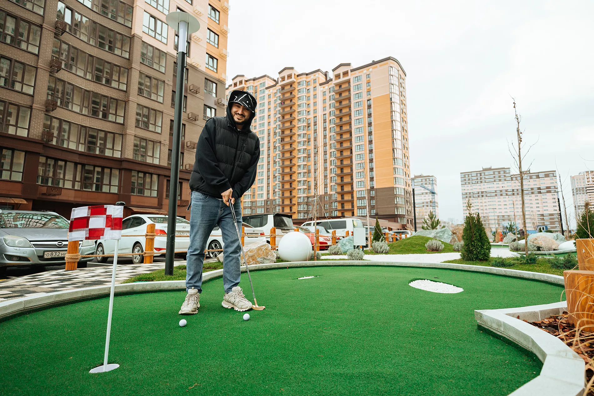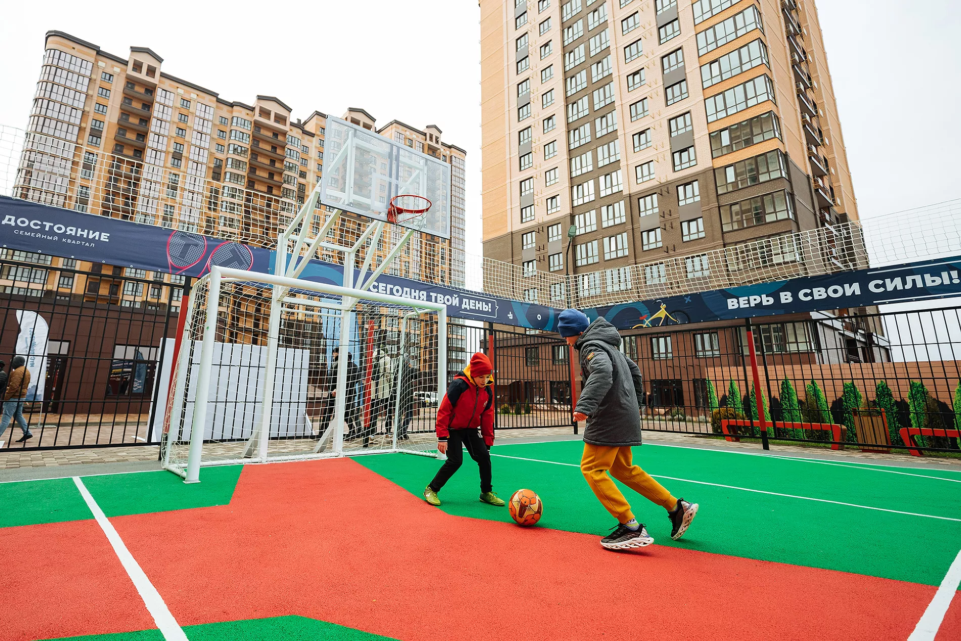 Девелопер отмечает, что проекты «ЮгСтройИнвест» — это всегда комплексная застройка с детскими садами, школами, современными паркингами, игровыми и спортивными площадками, зелеными аллеями с фонтанами и арт-объектами. Так, вместе с 12 и 13 литерами сдали игровые площадки, благоустроенную территорию и гольф-аллею.