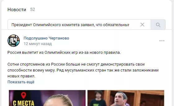 ВКонтакте появились десятки идентичных постов, начинающихся со слов «Россия вылетит из Олимпийских игр из-за нового правила. Ряд мусульманских стран также стали заложниками новых правил». Они размещены в локальных медиа: Серпухов, Типичное Бутово, Коломна, Типичный Реутов, Нахабино Online, Типичный Солнечногорск, Подслушано Королёв и т. д.