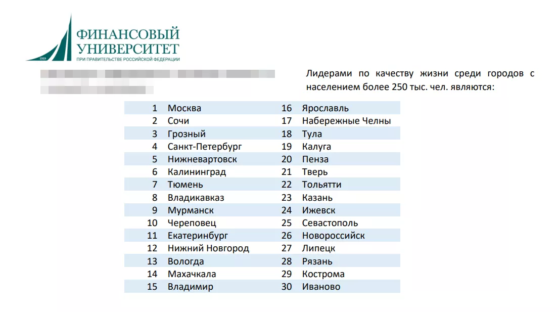Финансовый университет при Правительстве РФ опубликовал ежегодное исследование качества жизни в городах с населением более 250 тыс. человек.