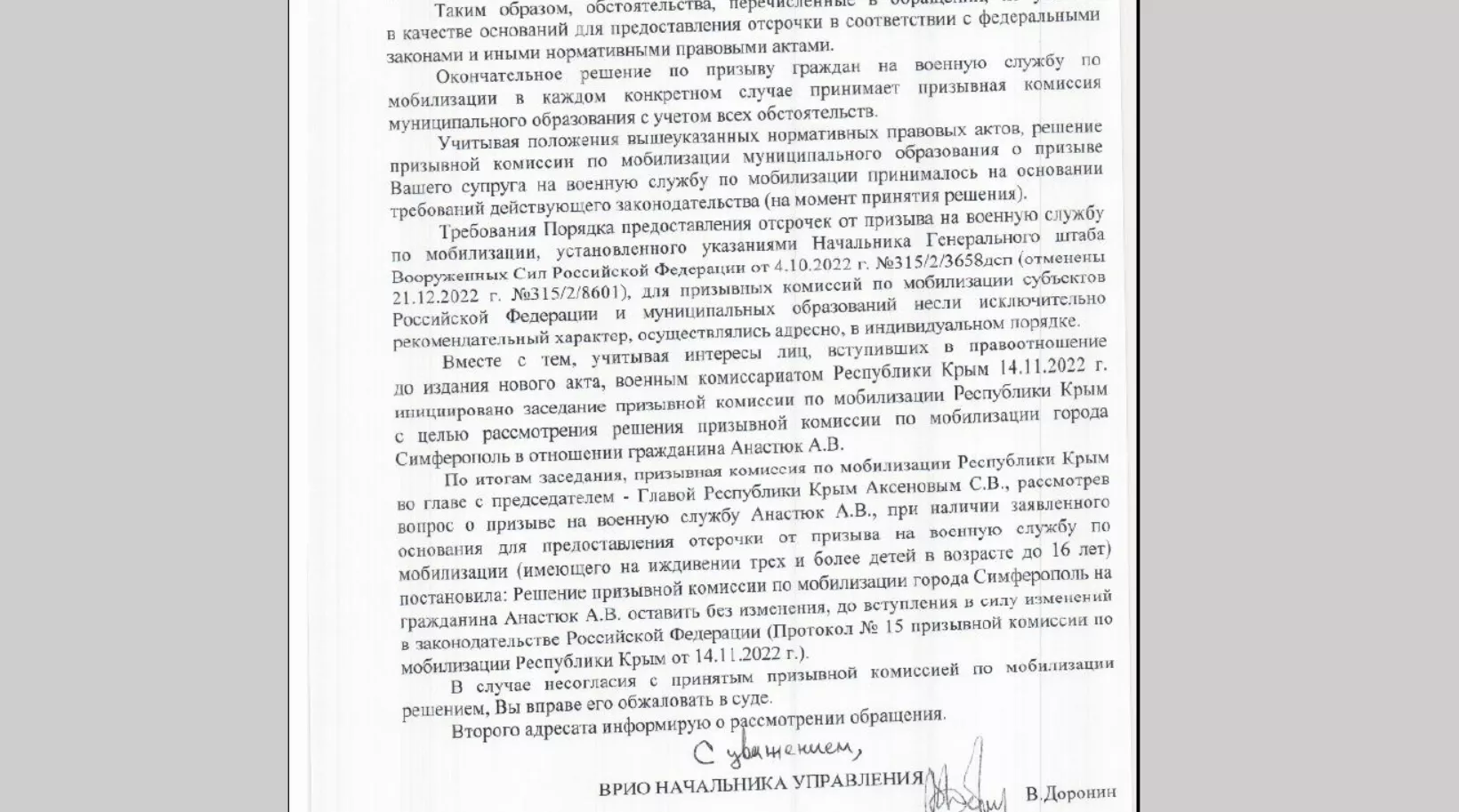 Далее врио начальника управления штаба ЮВО В. Доронин сообщил, что призывная комиссия Крыма оставила мобилизацию Анастюка без изменений «до вступления в силу изменений в законодательстве РФ».