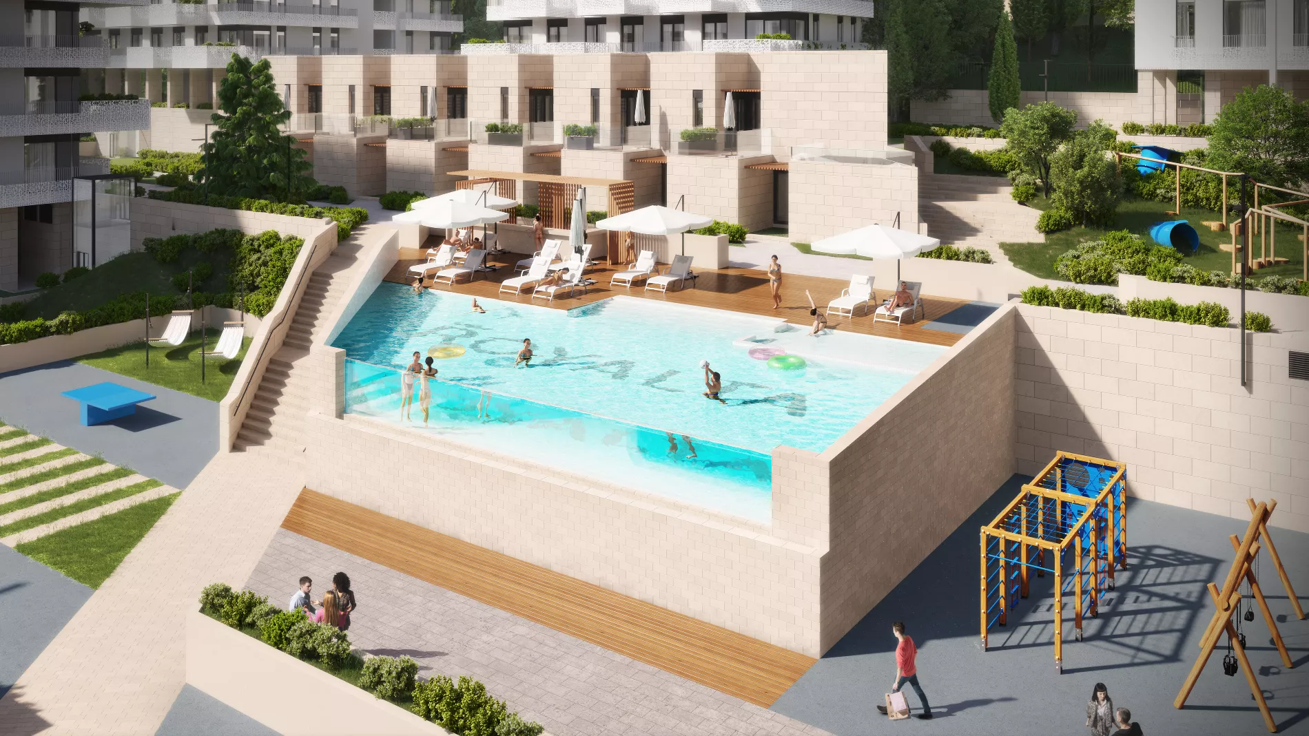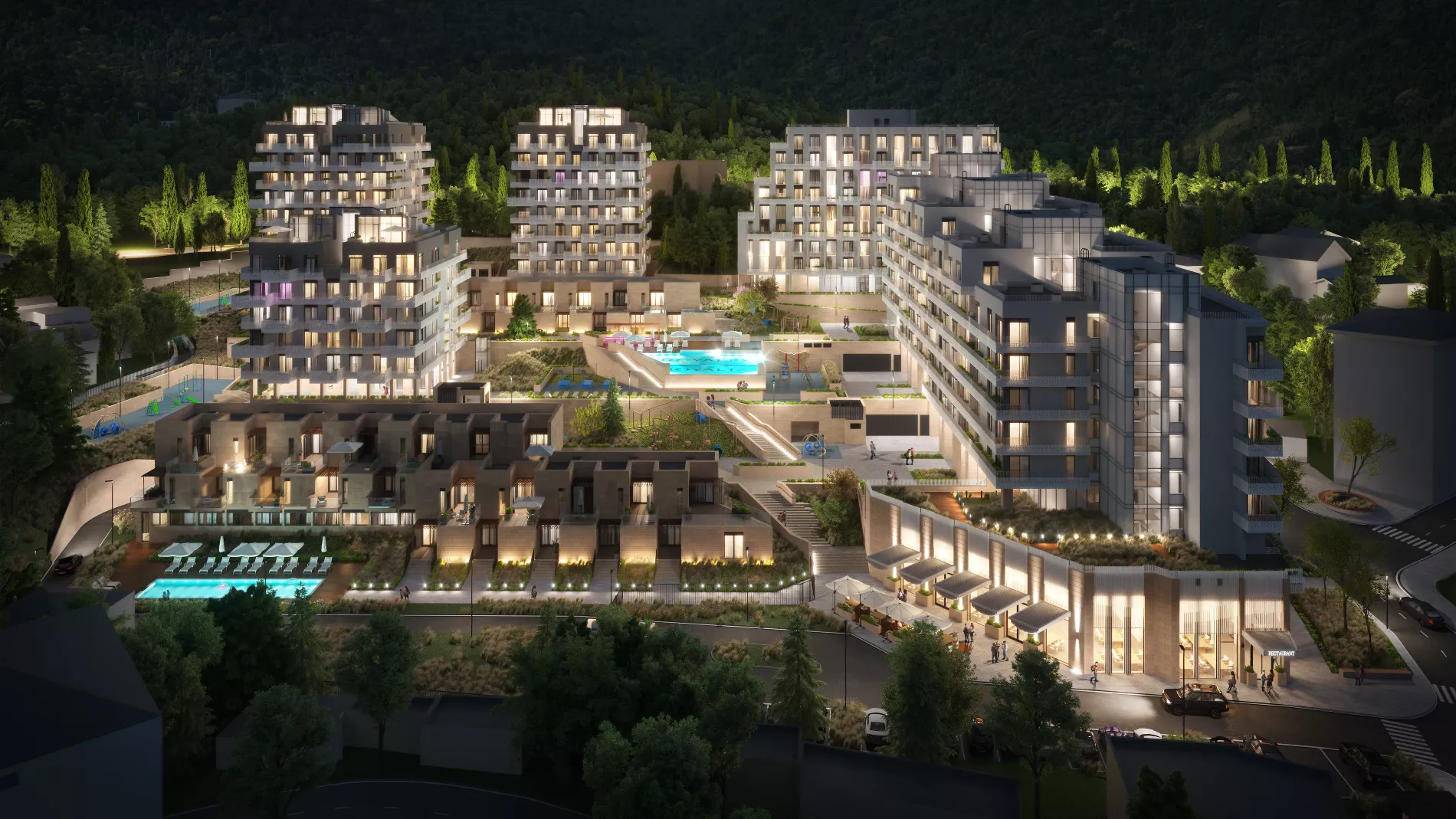 На территории комплекса обустроят двор с авторским озеленением, два бассейна, игровые площадки, воркаут-зону, стильные общественные пространства с ресторанами и барами премиум-класса, подземный паркинг, гостевую парковку и кладовые.