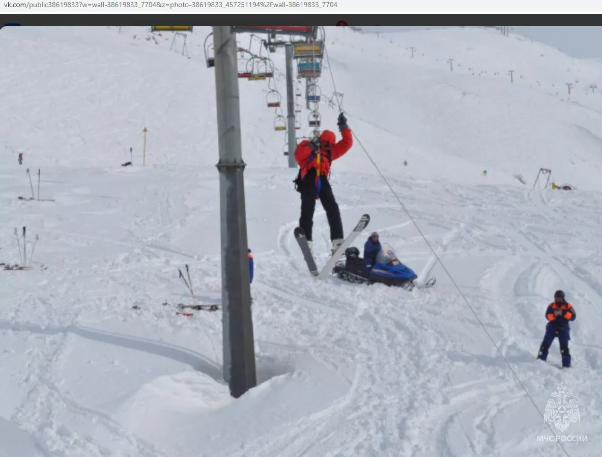 Горнолыжников снимали 15 спасателей с помощью спецтехники. Никто из отдыхающих не пострадал. Причины поломки канатной дороги выясняют специалисты.