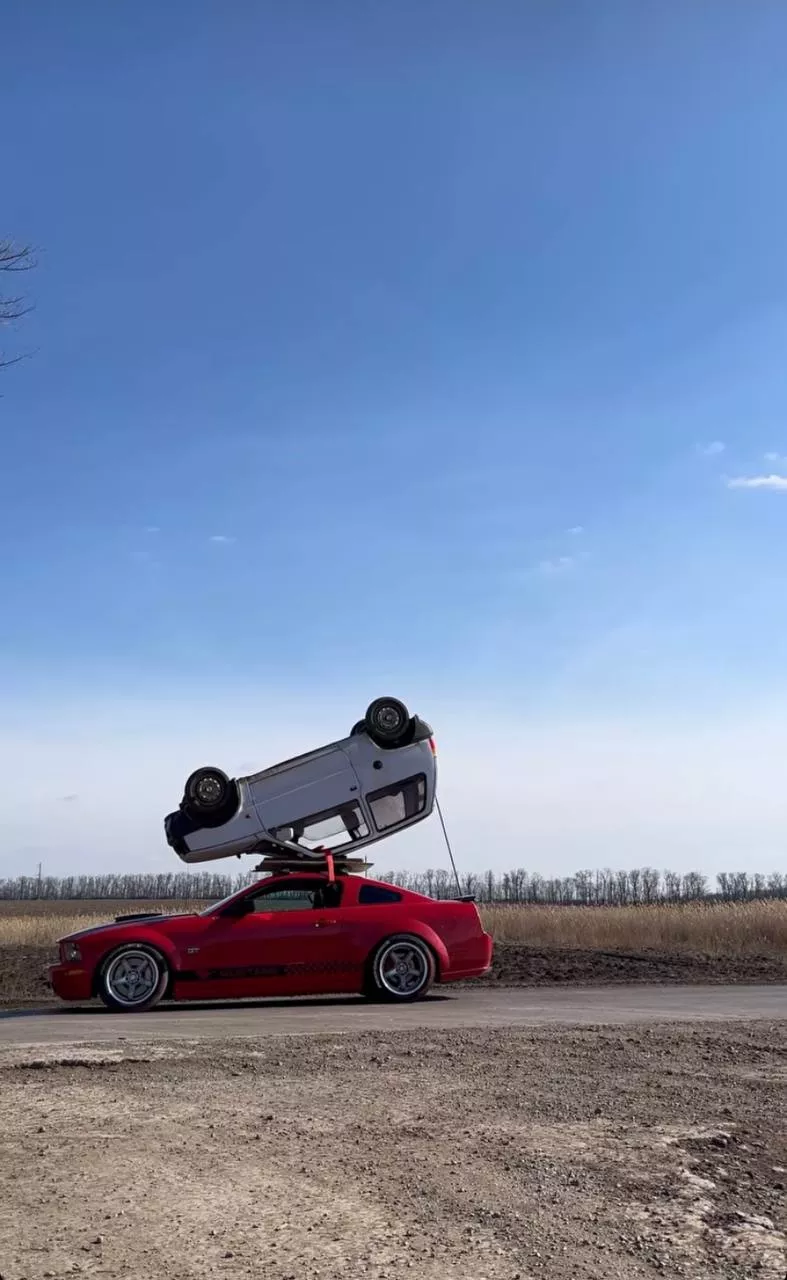 На дорогах Ростова-на-Дону 6 марта заметили красный «Мустанг» с перевернутой «Окой» на крыше. Видео с автомобилями появилось в социальных сетях.