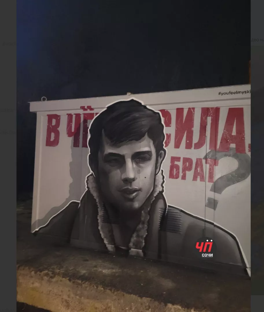 В Сочи дорисовали граффити с изображением Сергея Бодрова. Портрет актера разместили на фоне его самой известной реплики — «В чем сила, брат?». Фото граффити появилось в сети 5 апреля.