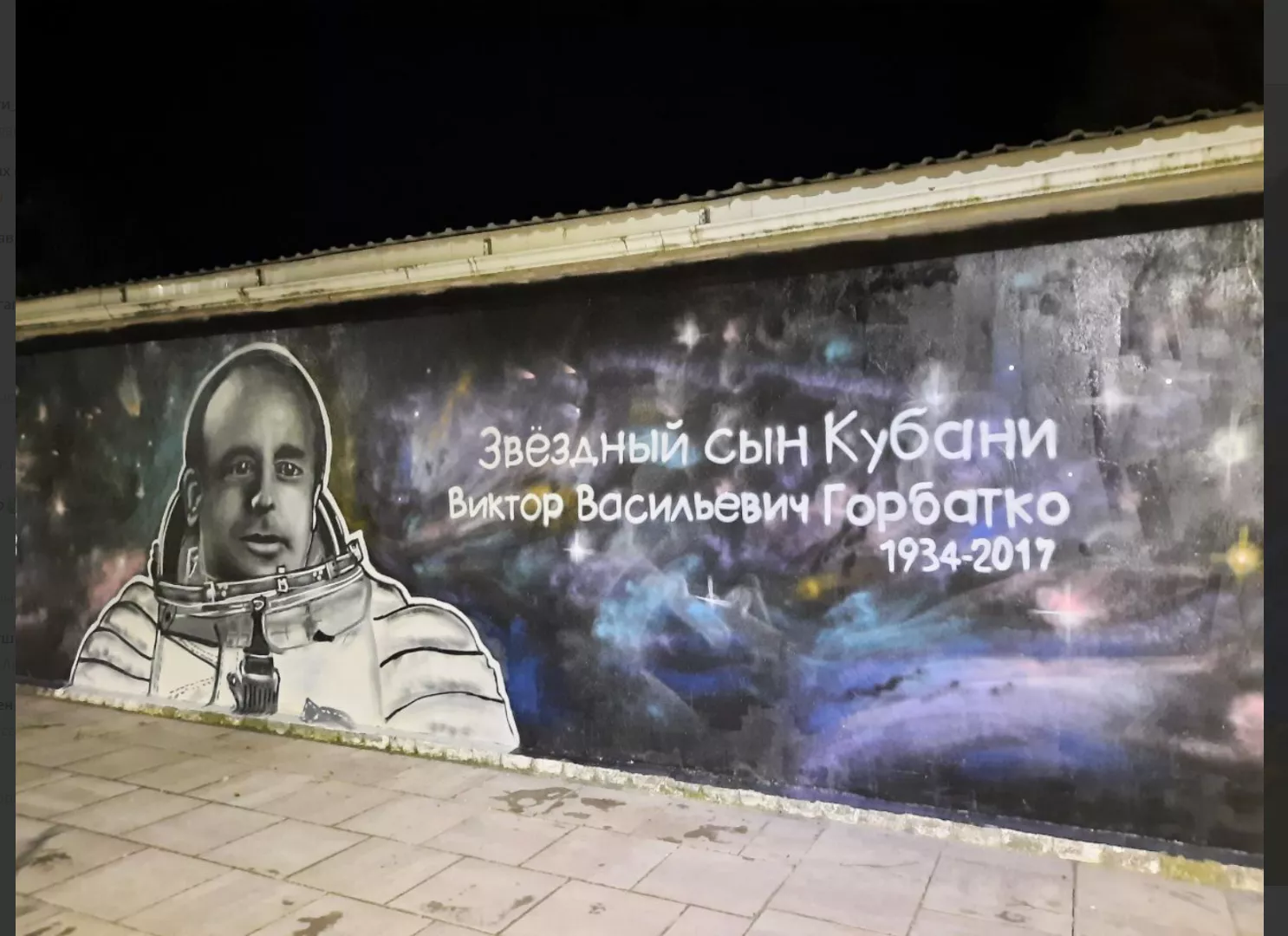 Новое городское граффити находится у бюста Гагарина. Рядом с портретами космонавтов надписи: «Первый человек в космосе Юрий Алексеевич Гагарин 1934-1968» и «Звездный сын Кубани Виктор Васильевич Горбатко 1934-2017».