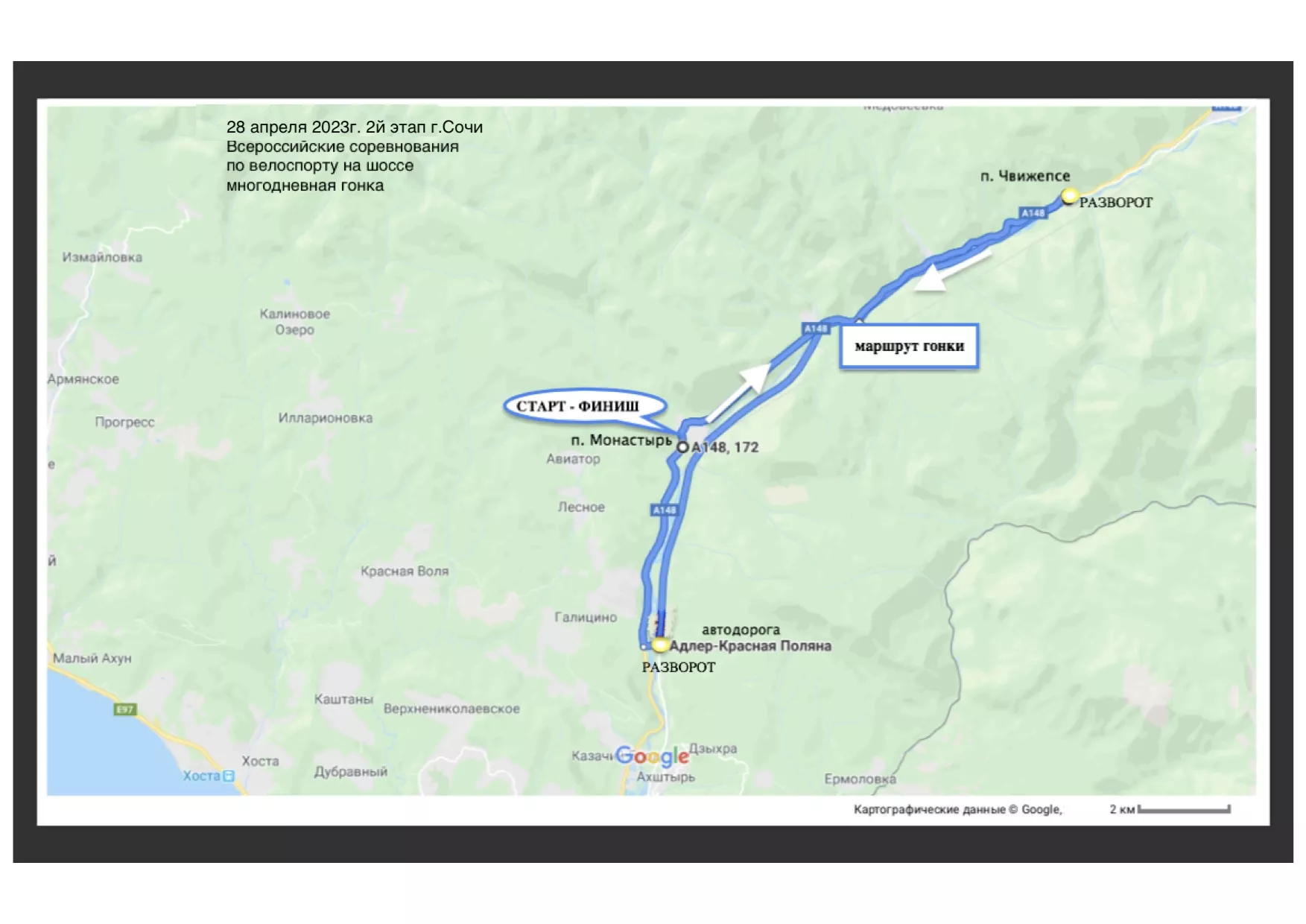 • 29 апреля велогонка пройдет по автодороге А-147 со стартом и финишем у храмового комплекса «Приют Святого Иоанна» с 10:30 до 16:00 часов. На время заезда приостановят движение автомобилей с дальнейшим восстановлением и ограничением скорости до 40 км в час в период проведения гонки.