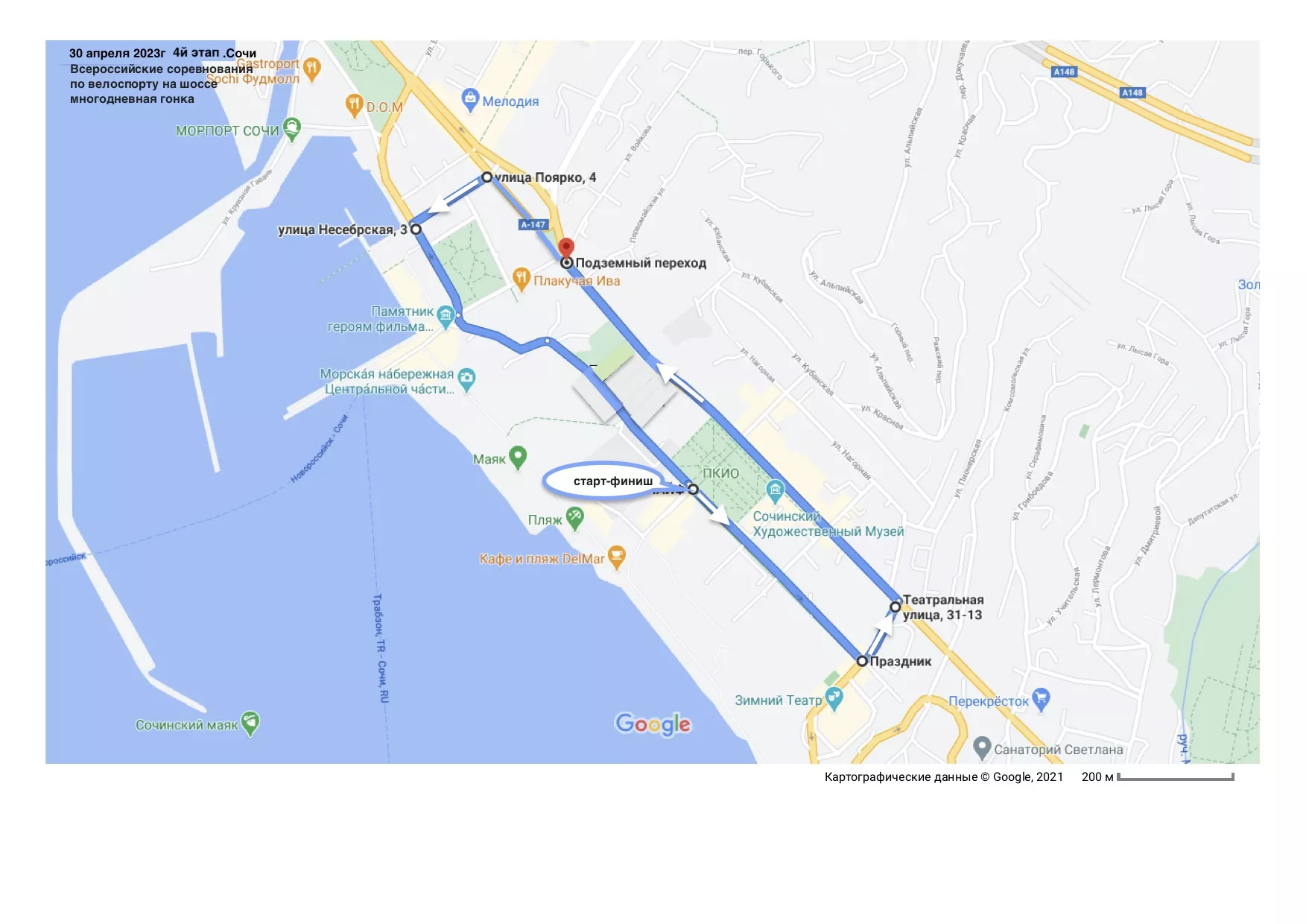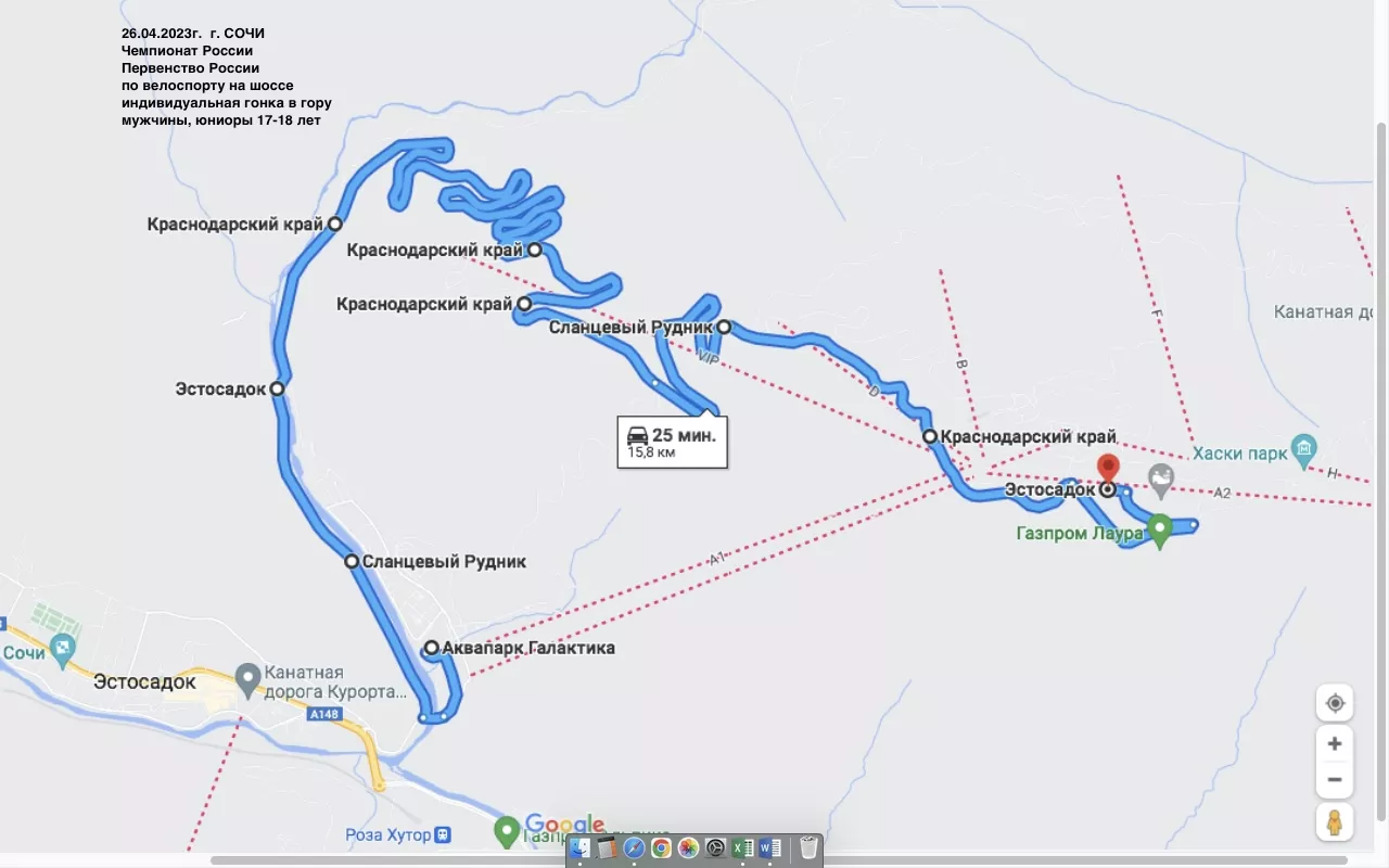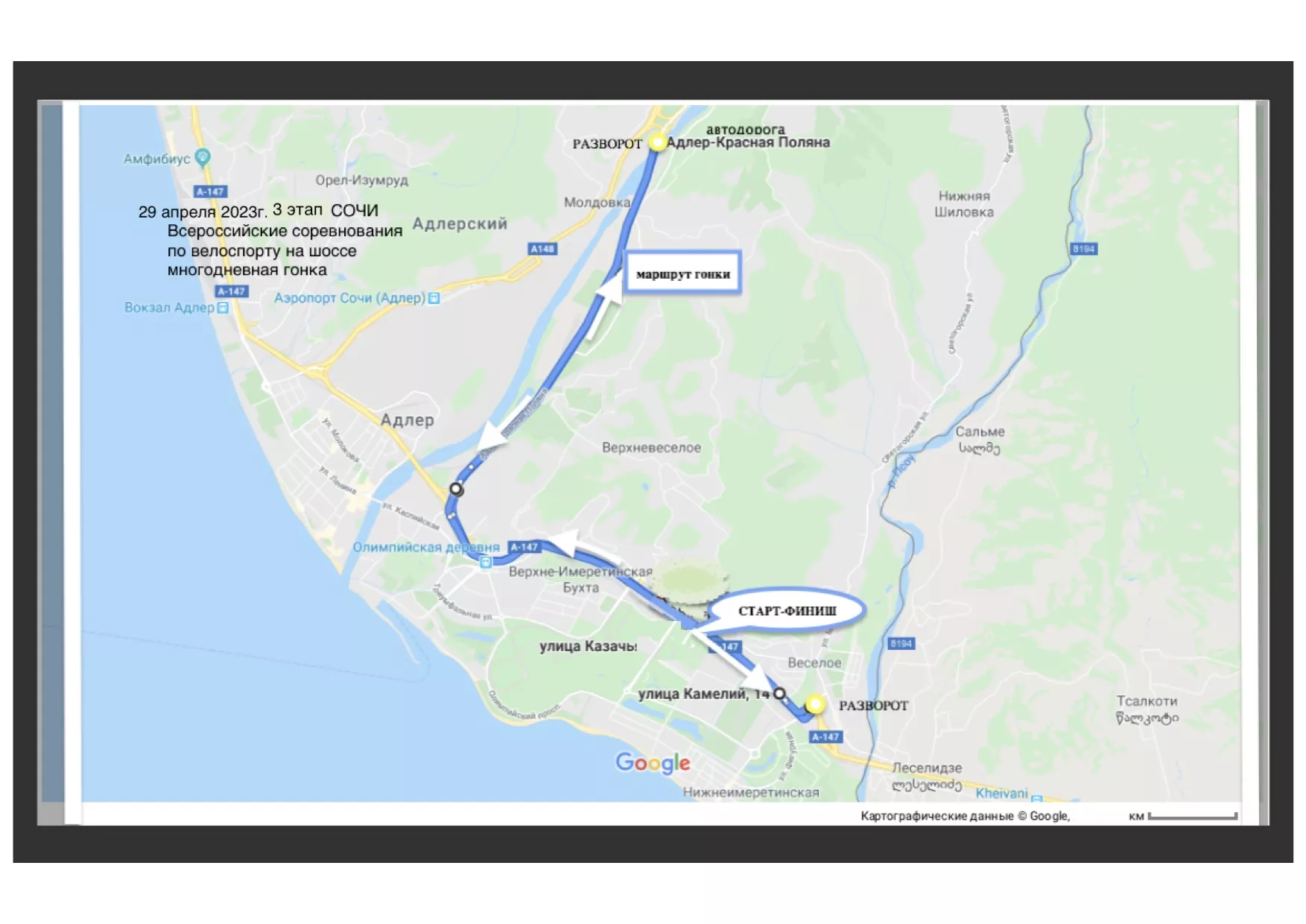 • 26 апреля старт заезда состоится на Курорте «Лаура» Газпром, пройдет по Ачипсинской улице и финиширует на биатлонном стадионе на высоте 1389 метров над уровнем моря.