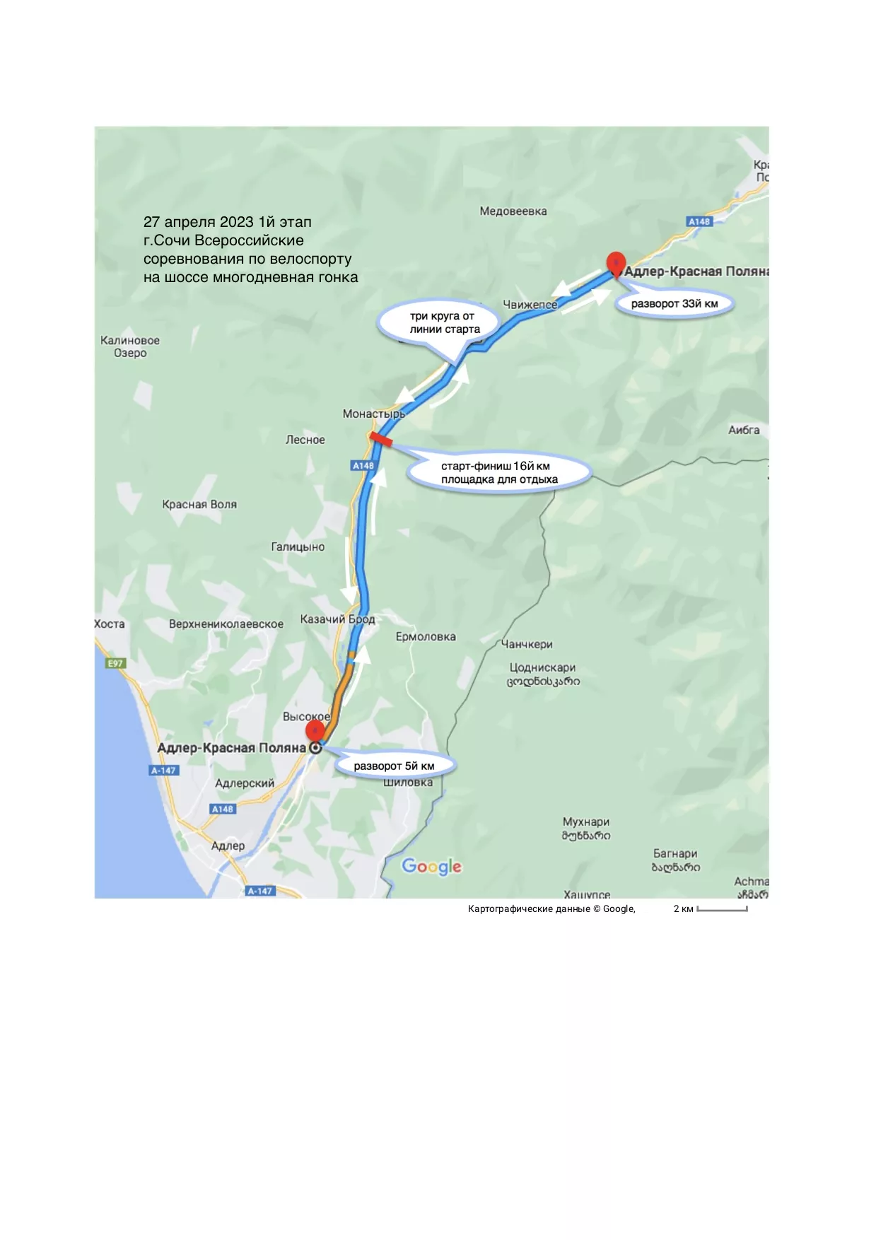 • 27 апреля спортсмены проедут дистанцию от 5 км автодороги А-149 «Адлер-Красная Поляна» до транспортной развязки поселка Чвижепсе и обратно. Заезд запланирован в период с 10:30 до 16:00 часов. На это время ограничат движение автомобилей и изменят три маршрута общественного транспорта: 105Э, 535Э, 571.