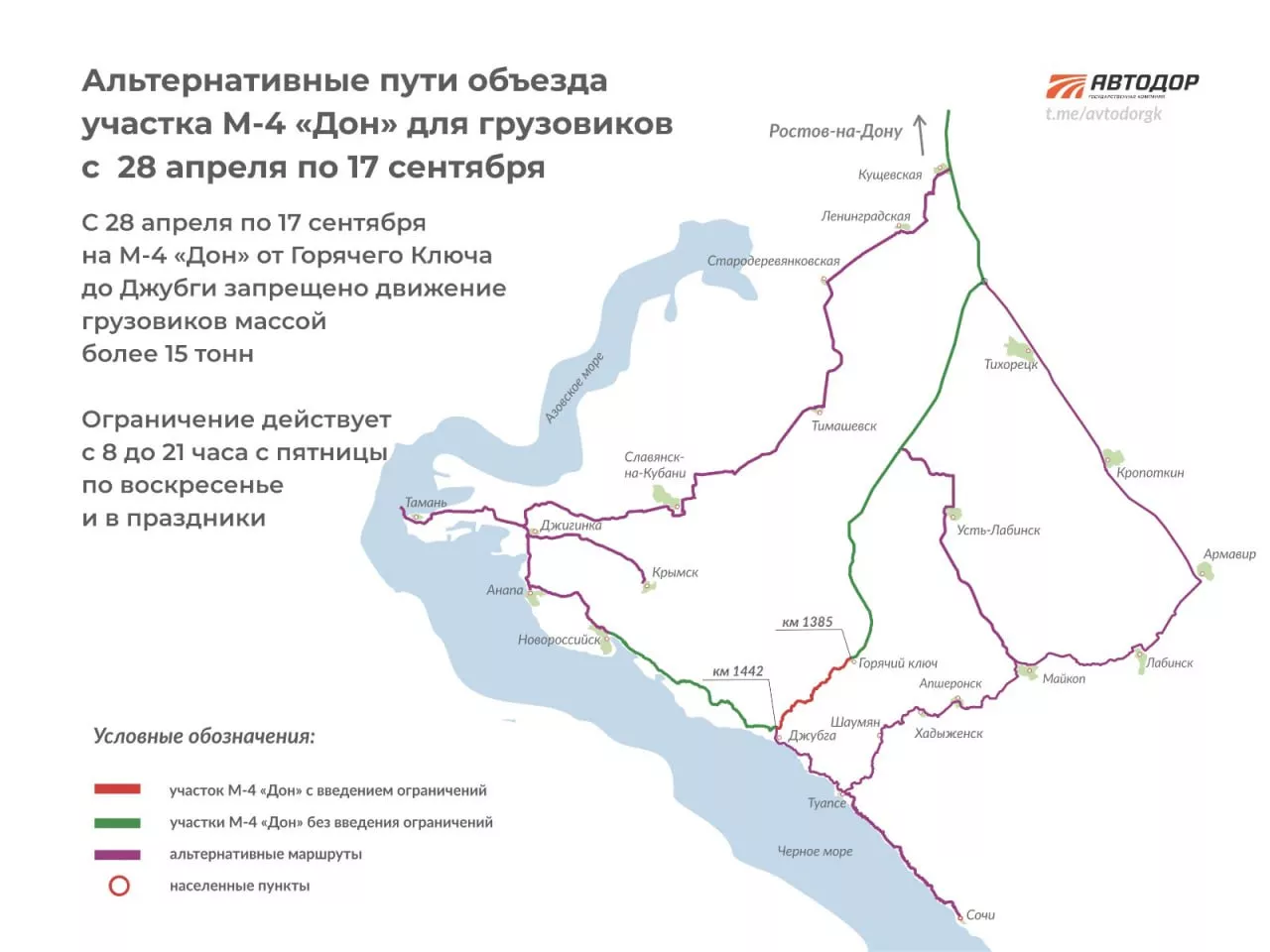На трассе М-4 «Дон» от Горячего Ключа до Джубги ограничат движение грузовикам массой более 15 тонн. Запрет будет действовать с 28 апреля по 17 сентября, сообщили в «Автодоре».