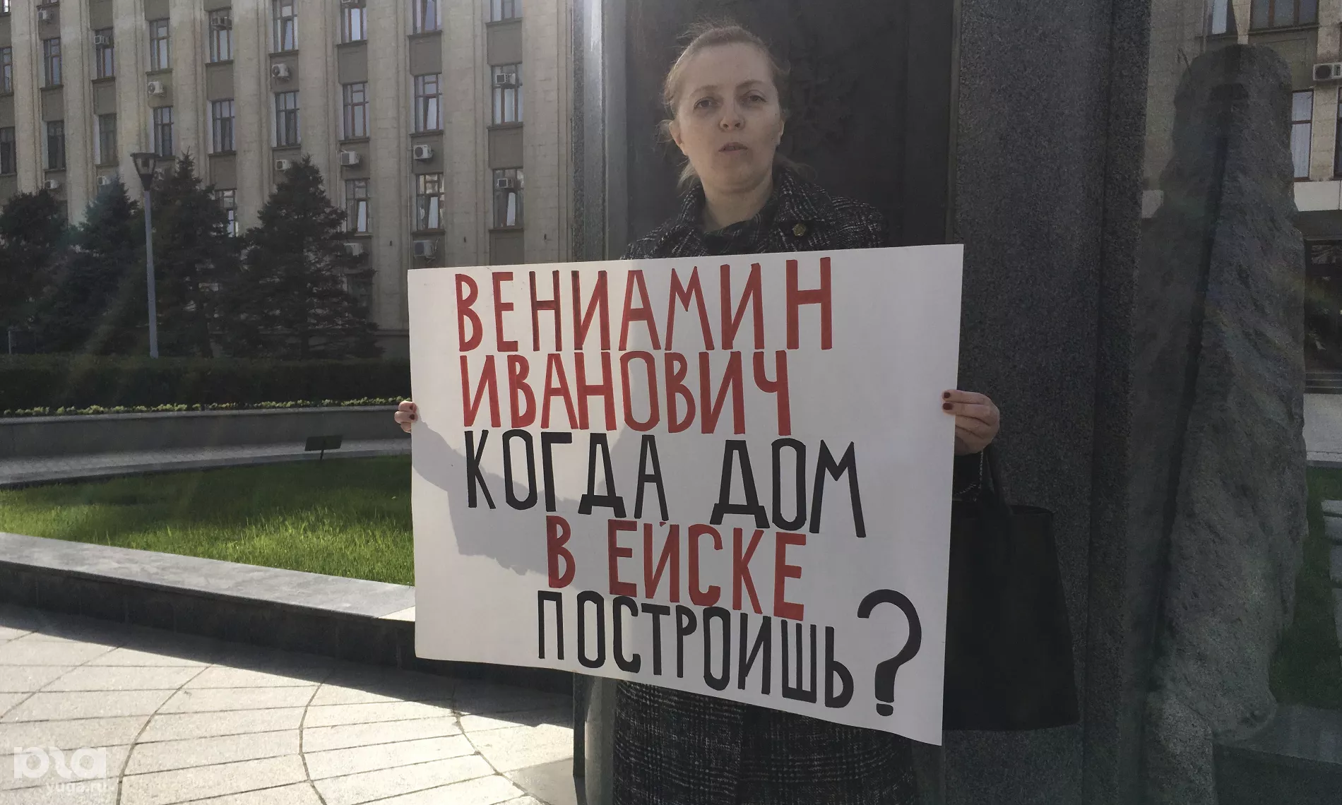 Антонова встала у администрации Краснодарского края с плакатом: «Вениамин Иванович, когда дом в Ейске построишь?». Месяц назад она уже обращалась к Кондратьеву с требованием восстановить жилой девятиэтажный дом на Коммунистической, 20/1, четыре подъезда которого разрушил пожар после падения бомбардировщика.