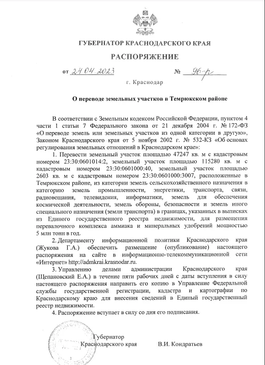 Согласно распоряжению, назначение изменили трем участкам с кадастровыми номерами 23:30:0601014:2, 23:30:0601000:40, 23:36:0601000:3007. Их общая площадь составляет 16,1 га. В документе сказано, что категорию землям изменили для размещения на них перевалочного комплекса аммиака и минеральных удобрений мощностью 5 млн тонн в год.