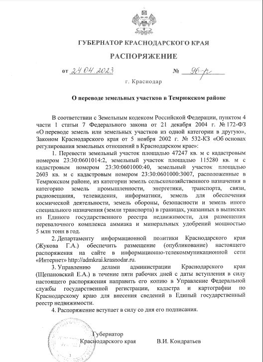 Согласно распоряжению, назначение изменили трем участкам с кадастровыми номерами 23:30:0601014:2, 23:30:0601000:40, 23:36:0601000:3007. Их общая площадь составляет 16,1 га. В документе сказано, что категорию землям изменили для размещения на них перевалочного комплекса аммиака и минеральных удобрений мощностью 5 млн тонн в год.