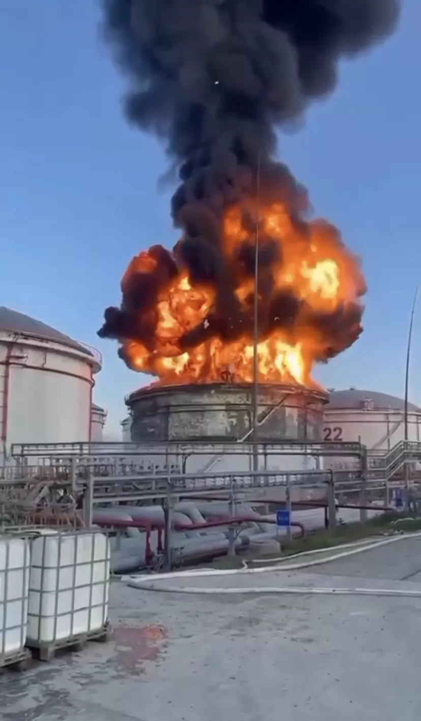 Обновление в 9:55: по данным ТАСС, пожар произошел из-за падения беспилотника. Губернатор Кубани написал, что пожар все еще тушат. На месте работают 188 человек. Также к тушению привлекли пять пожарных поездов.