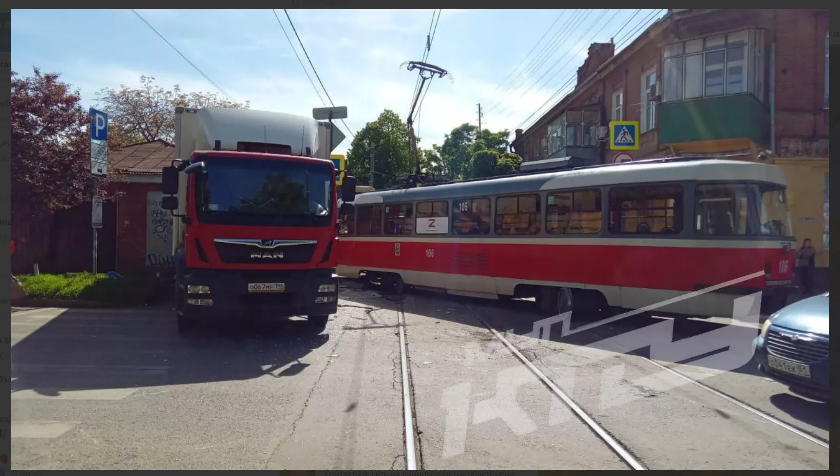 В центре Краснодара трамвай сошел с рельс при столкновении с грузовиком