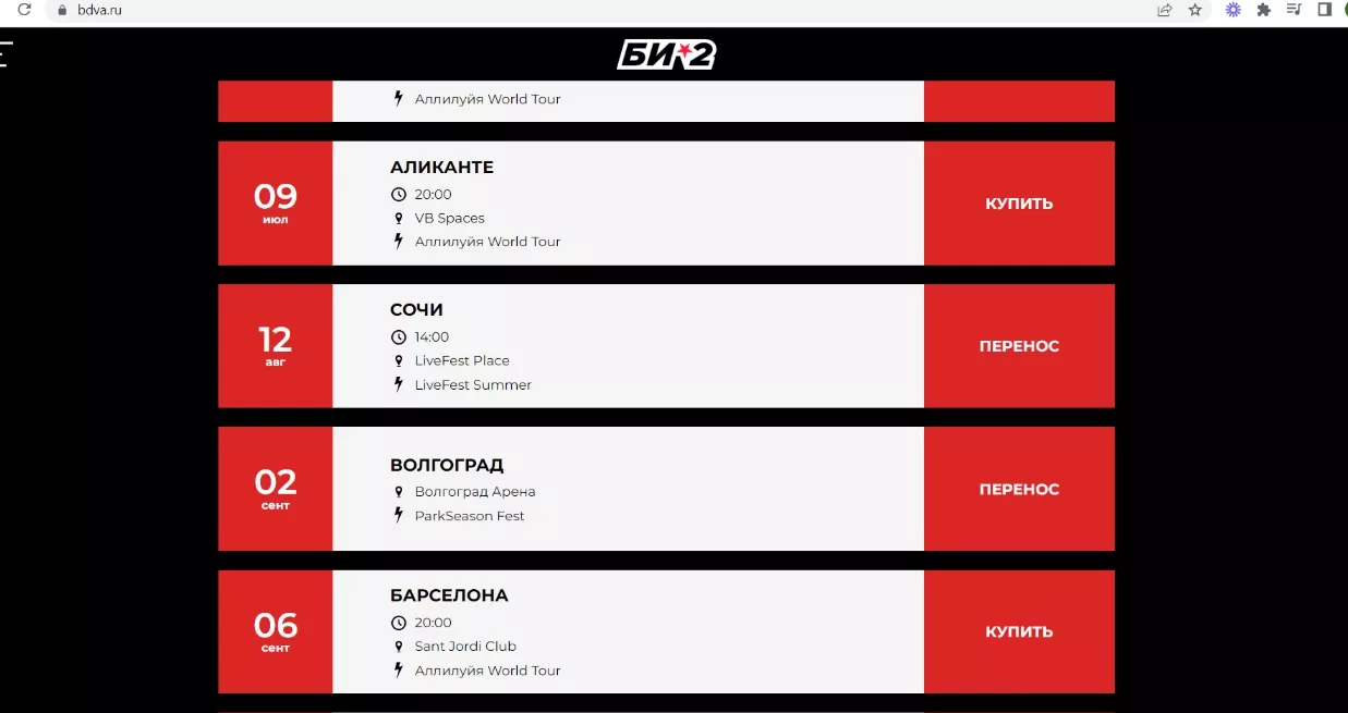 Сейчас «Би-2» гастролирует в США, в России ближайшим должен был стать концерт в Москве 10 июня. О его переносе информации на сайте пока нет, но, как сообщает «Коммерсантъ», в соцсетях солист группы писал, что продажа билетов на концерты в Москве, Сочи и Волгограде является «формальностью». На момент публикации новости страница для покупки билетов на концерт в Москве недоступна.
