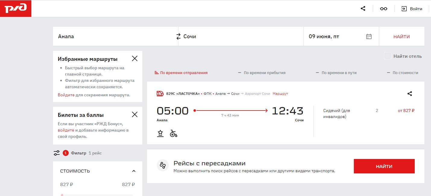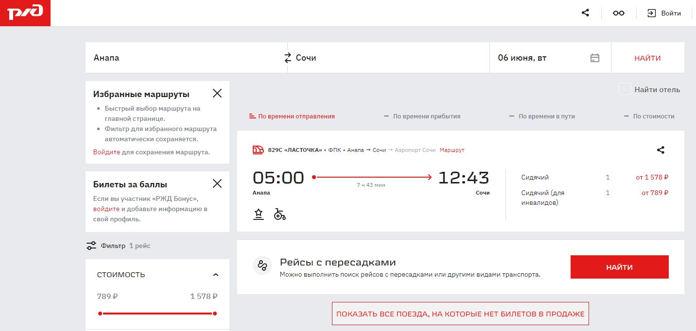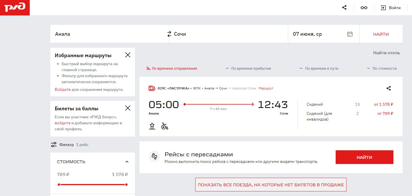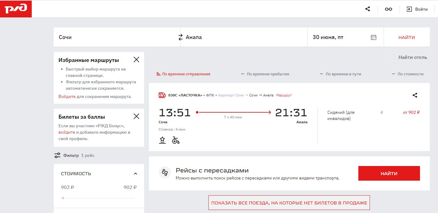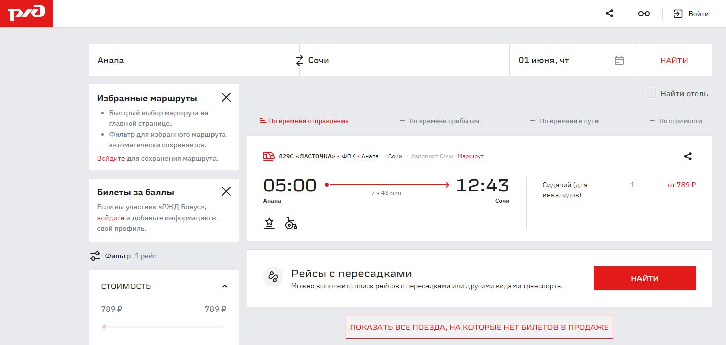 На некоторые даты можно купить сидячие места для людей с ограниченными возможностями здоровья, следует из данных сервиса по продаже билетов ОАО «РЖД». Агрегатор предлагает изменить условия поиска или проложить сложный маршрут с пересадкой.
