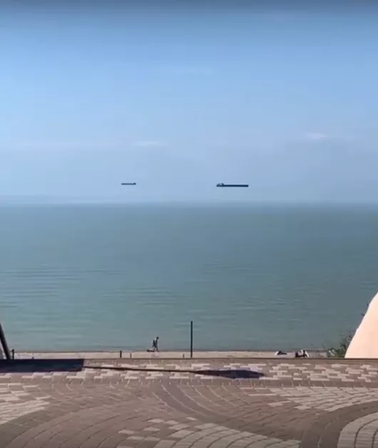 Жителям Ейска удалось снять на видео редкую оптическую иллюзию — фата-моргану. Именно она заставила «парить» в небе два корабля.
