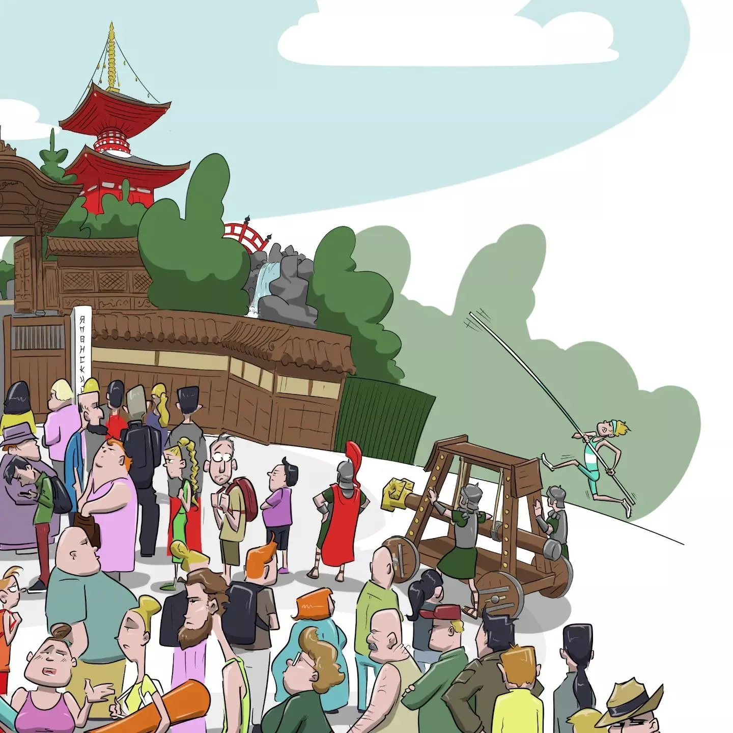 Также художник показал фотографов и моделей в японской одежде. А с другой стороны спортсмен пытается перепрыгнуть забор с помощью шеста.