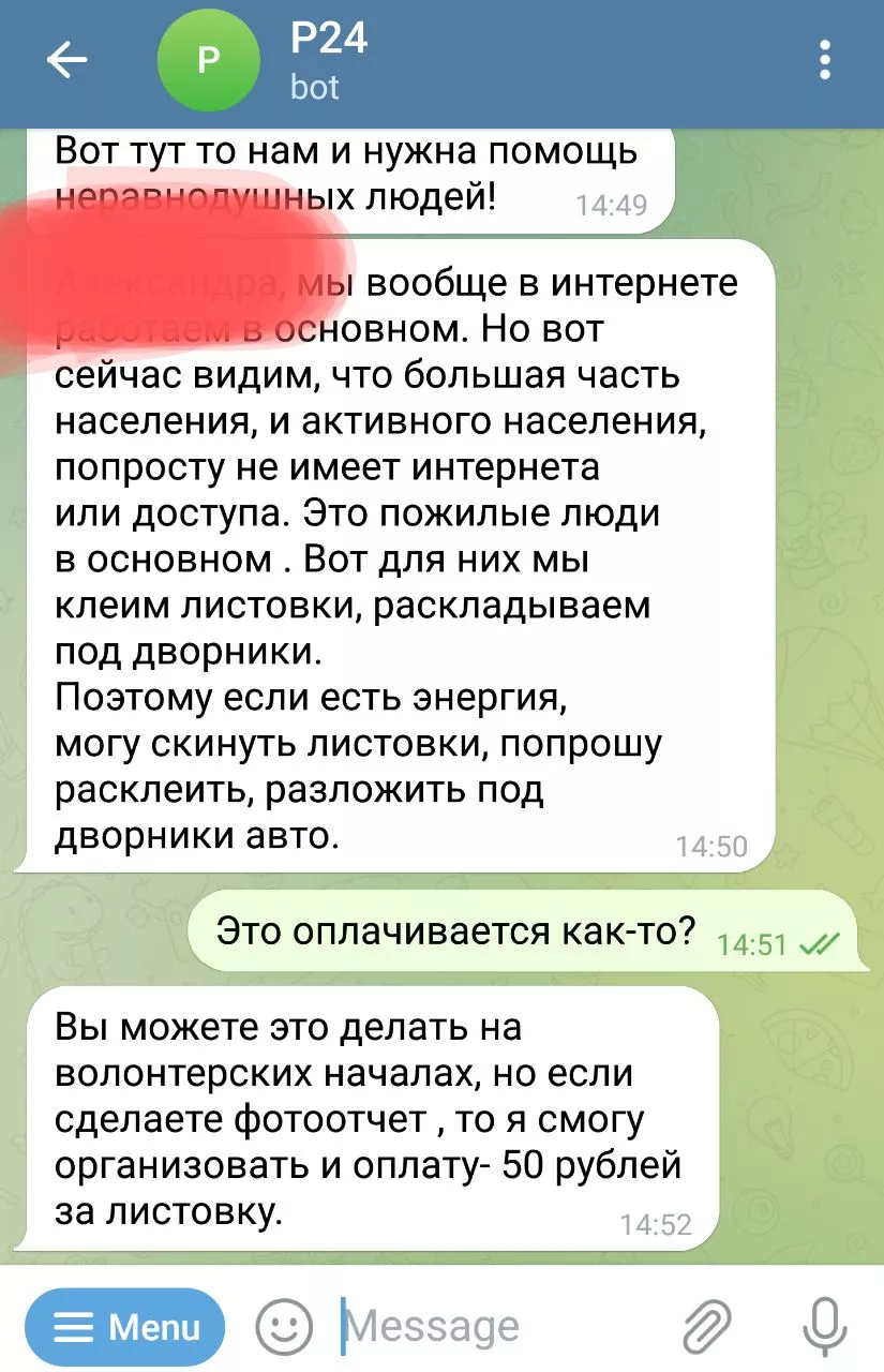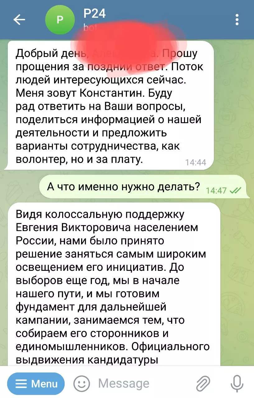Если сообщить чат-боту свой номер и город, пользователю предлагают участие в предвыборной кампании бизнесмена волонтером или за плату. Например, расклеивать листовки по 50 рублей за штуку.