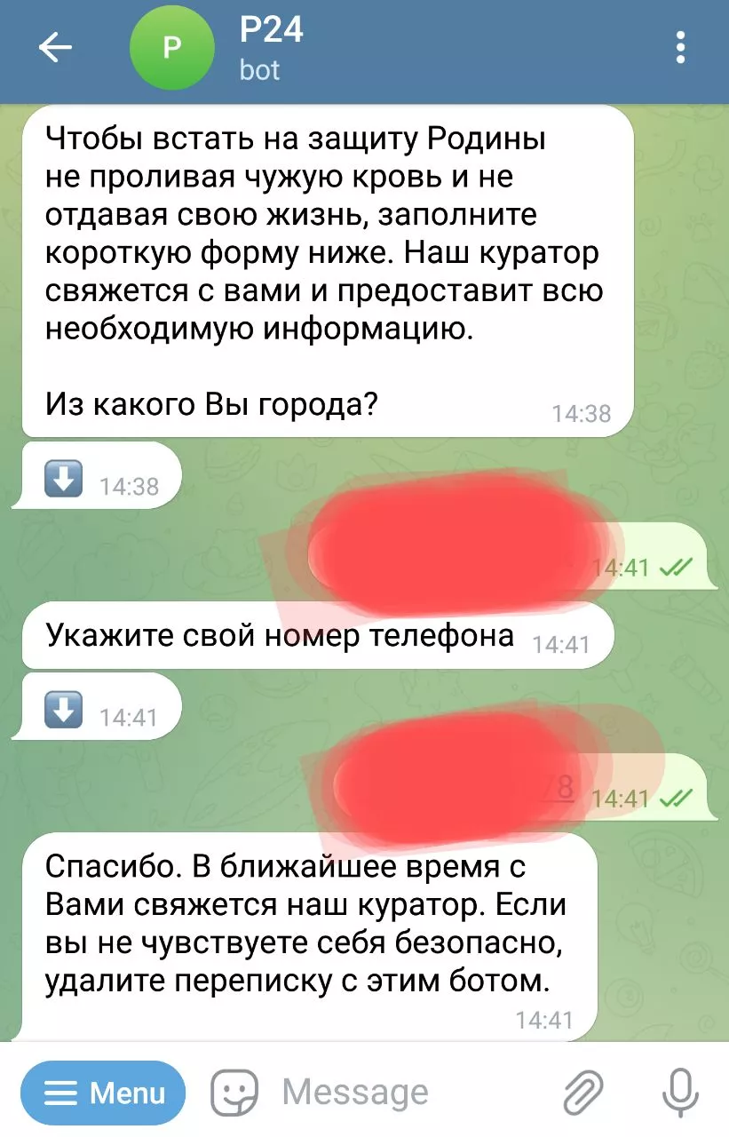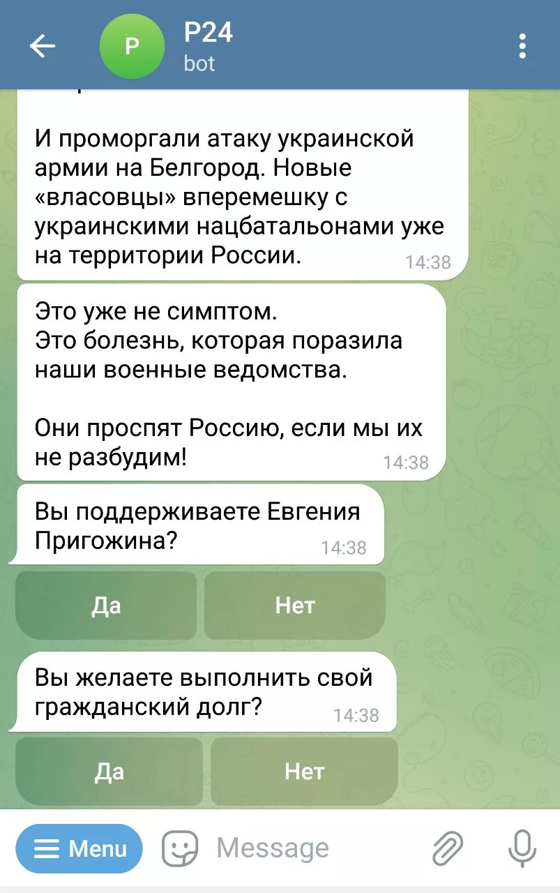 Также на сайте есть ссылка на чат-бот в телеграме, где пользователей спрашивают, готовы ли они выполнить свой гражданский долг и поддерживают ли Пригожина.