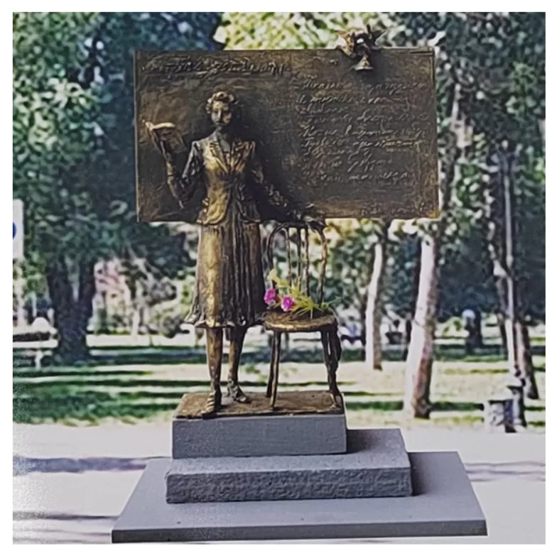 - Проект 3. Композиция учительницы у доски с книгой. Она пишет припев стихотворения «Школьные годы чудесные» Евгения Долматовского. Над доской птицы, несущие на ленте колокольчик. Фигура — 2,2 метра. Материалы: бронза и постанета;
