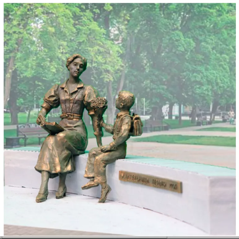 - Проект 5. Памятник изображает учительницу с книгой в руках. Рядом школьник, который дарит ей цветы на 1 сентября. Оба сидят на гранитной скамье. Фигура будет оснащена QR-кодом. С его помощью можно будет узнать об учителях и образовании. Материалы: бронза и гранит;