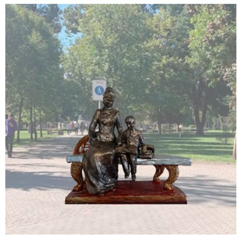 - Проект 6. Образ представлен в виде скульптурной группы учительницы и ученика 19 века за чтением. Они сидят на декоративной скамейке. Материалы: бронза, мрамор, бетон;