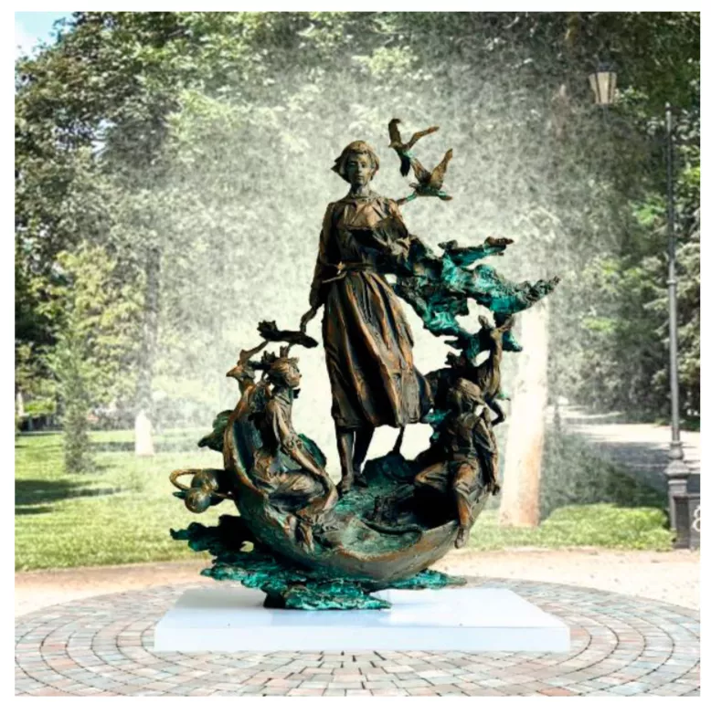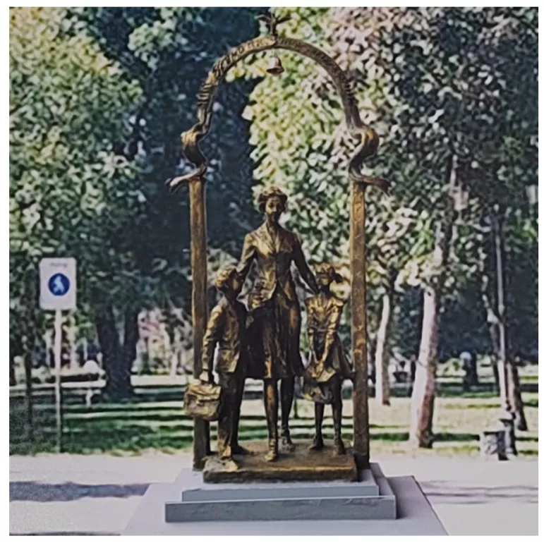 - Проект 7. Учительница входит в школу с детьми. Над ее головой лента в виде арки. В центре наверху птицы, несущие на ленте колокольчик. Материалы: бронза, постамент гранит. Фигура учительницы 2,2 м. Дети — 1,6.
