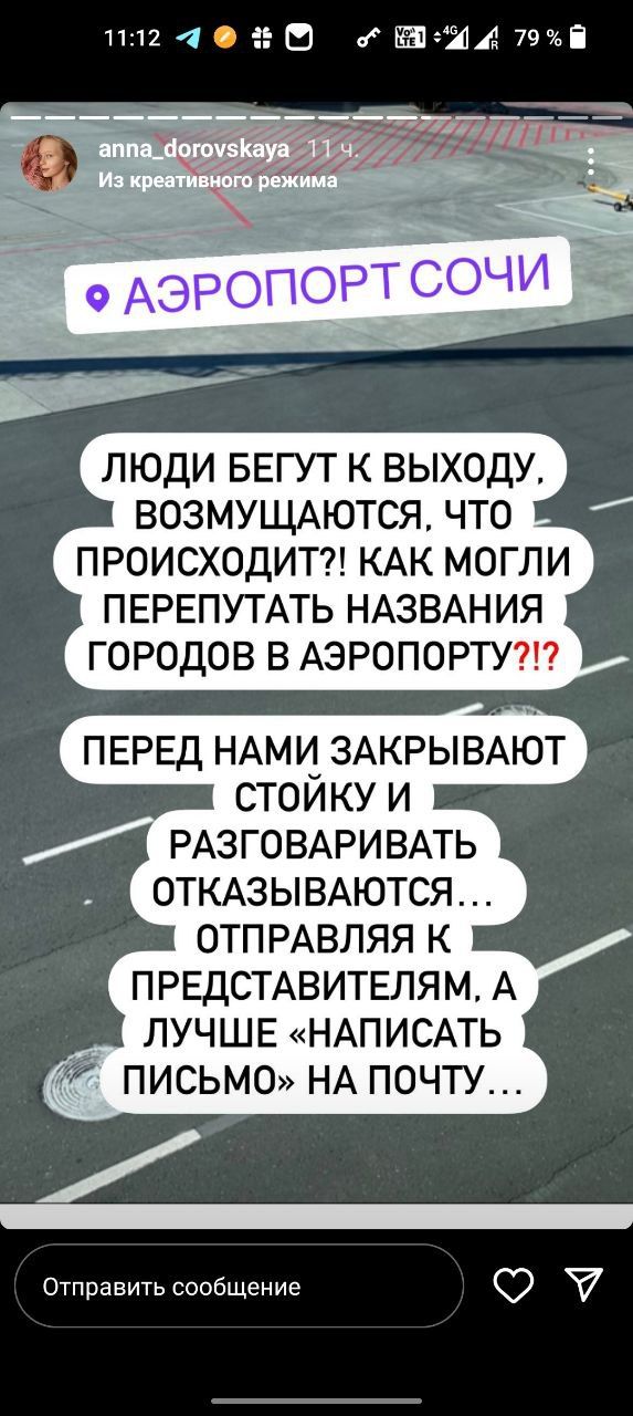 В запрещенной в России соцсети 11 июня участница детского вокального ТВ-шоу рассказала о том, что опоздала на рейс и Сочи в Саратов. По словам Анны Доровской, она в компании других пассажиров находилась прямо у выхода на посадку, но из-за ошибки в объявлении рейсов в самолет они не попали.