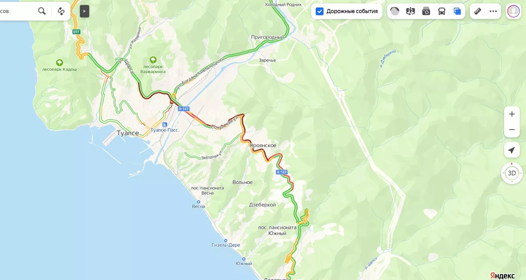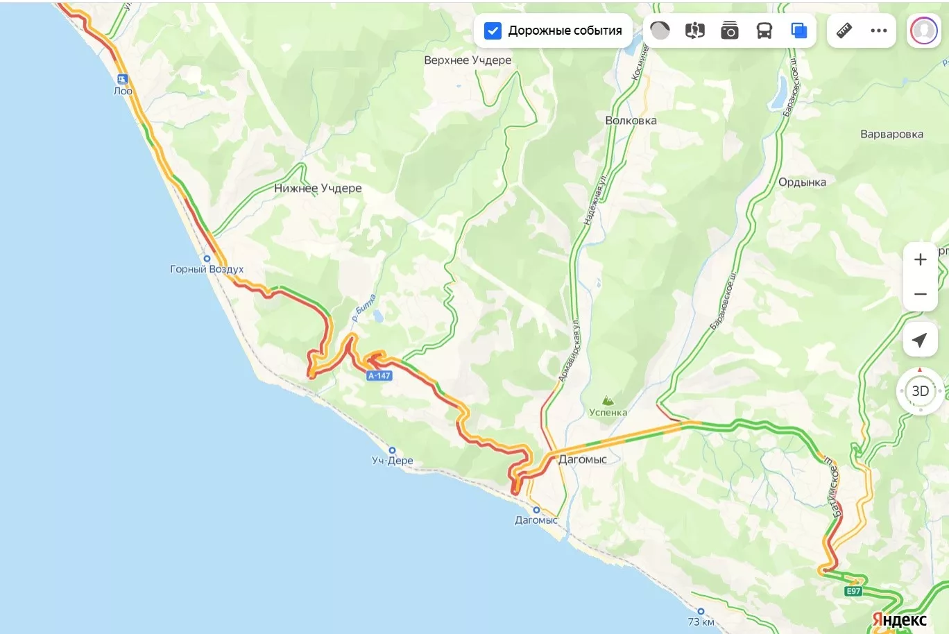 21 июля в Краснодарском крае по дороге к морю образовались пробки. По данным сервиса «Яндекс. Карты», самый большой затор длиной около 10 км — на участке от Лоо до Дагомыса.