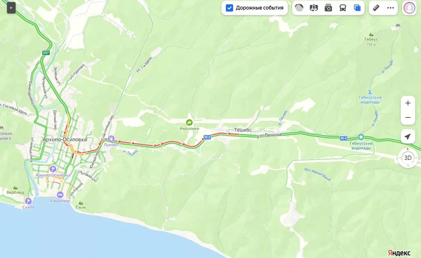 Пробка от Туапсе в сторону Агоя растянулась на 6 км, а с въезда в поселок Архипо-Осиповка до центра — на 4 км.