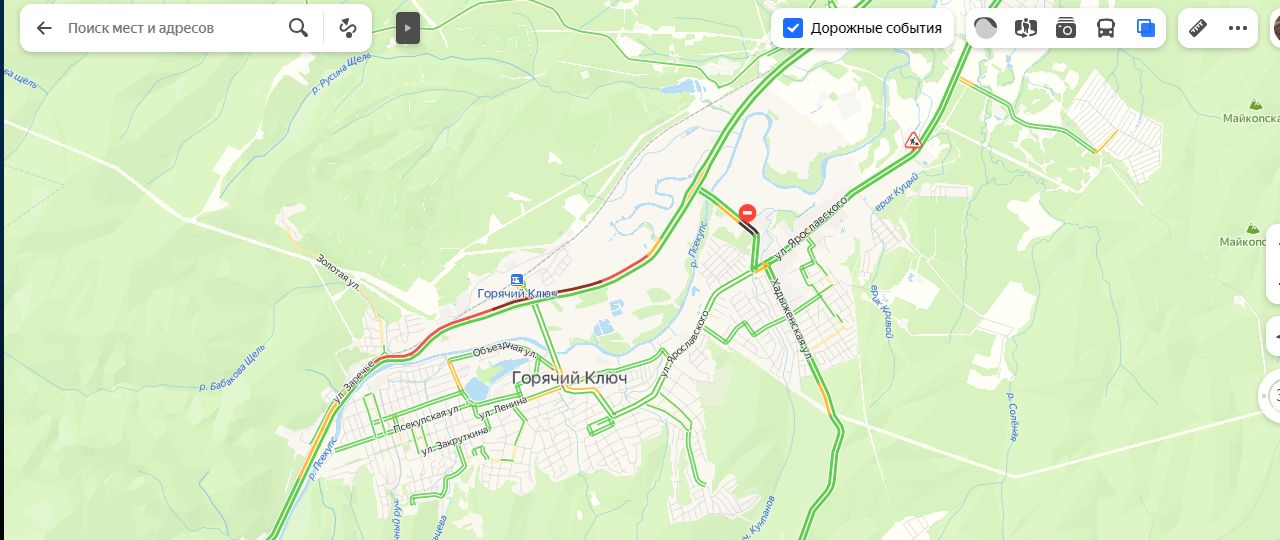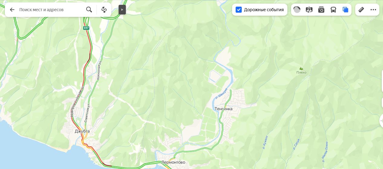 7-километровый затор есть на въезде в Джубгу. «Яндекс.Карты» оценивают его в 9-10 баллов. Также пользователи сервиса сообщают о ДТП.