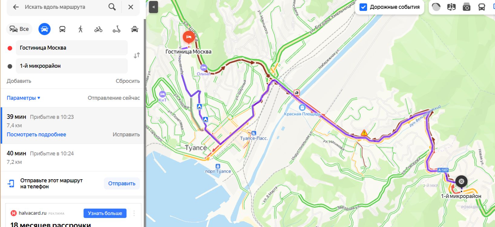 Пробка в районе Туапсе растянулась в обе стороны. Участок от гостиницы «Москва» до 1-ого микрорайона длиной 7,4 км можно проехать только за 40 минут.