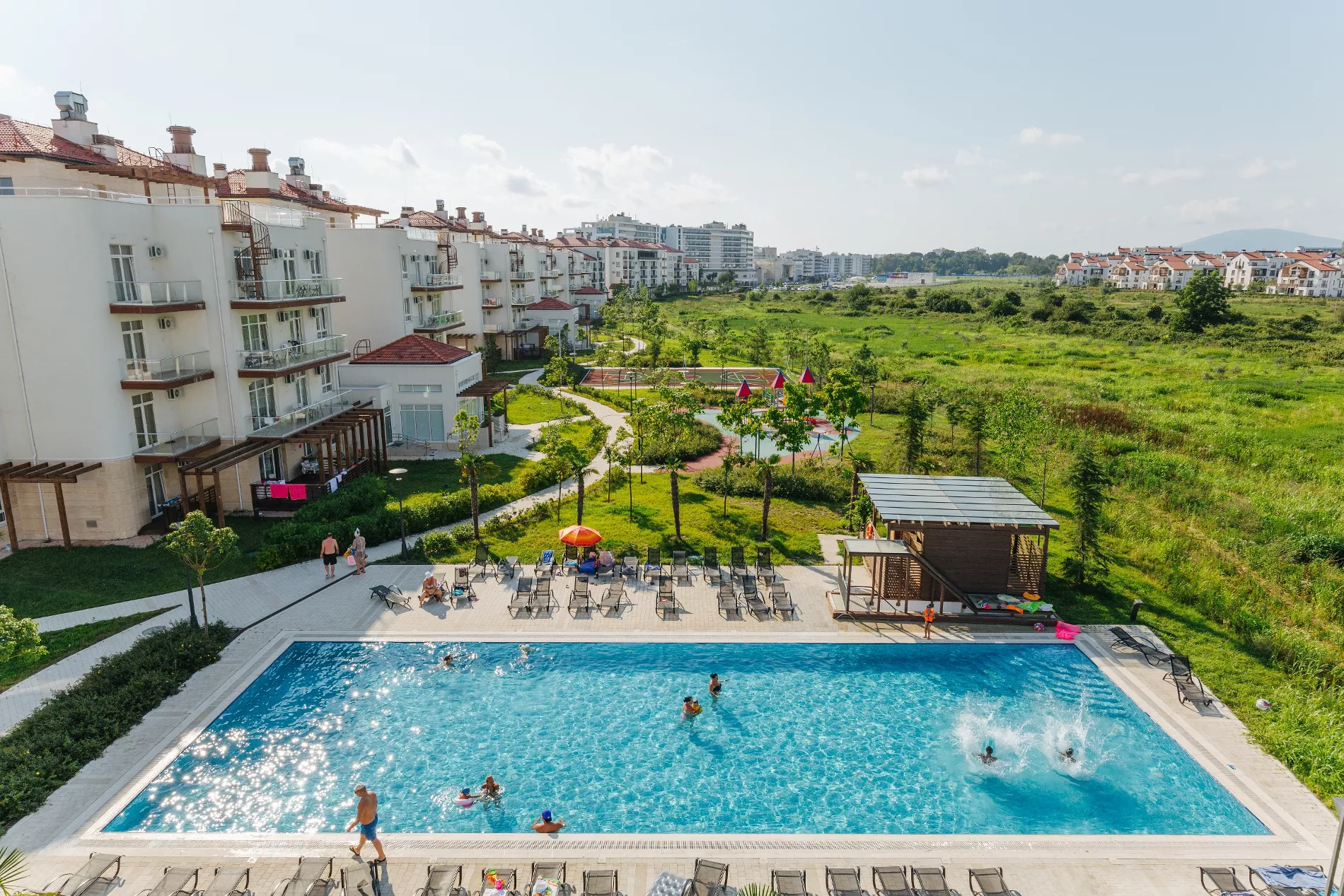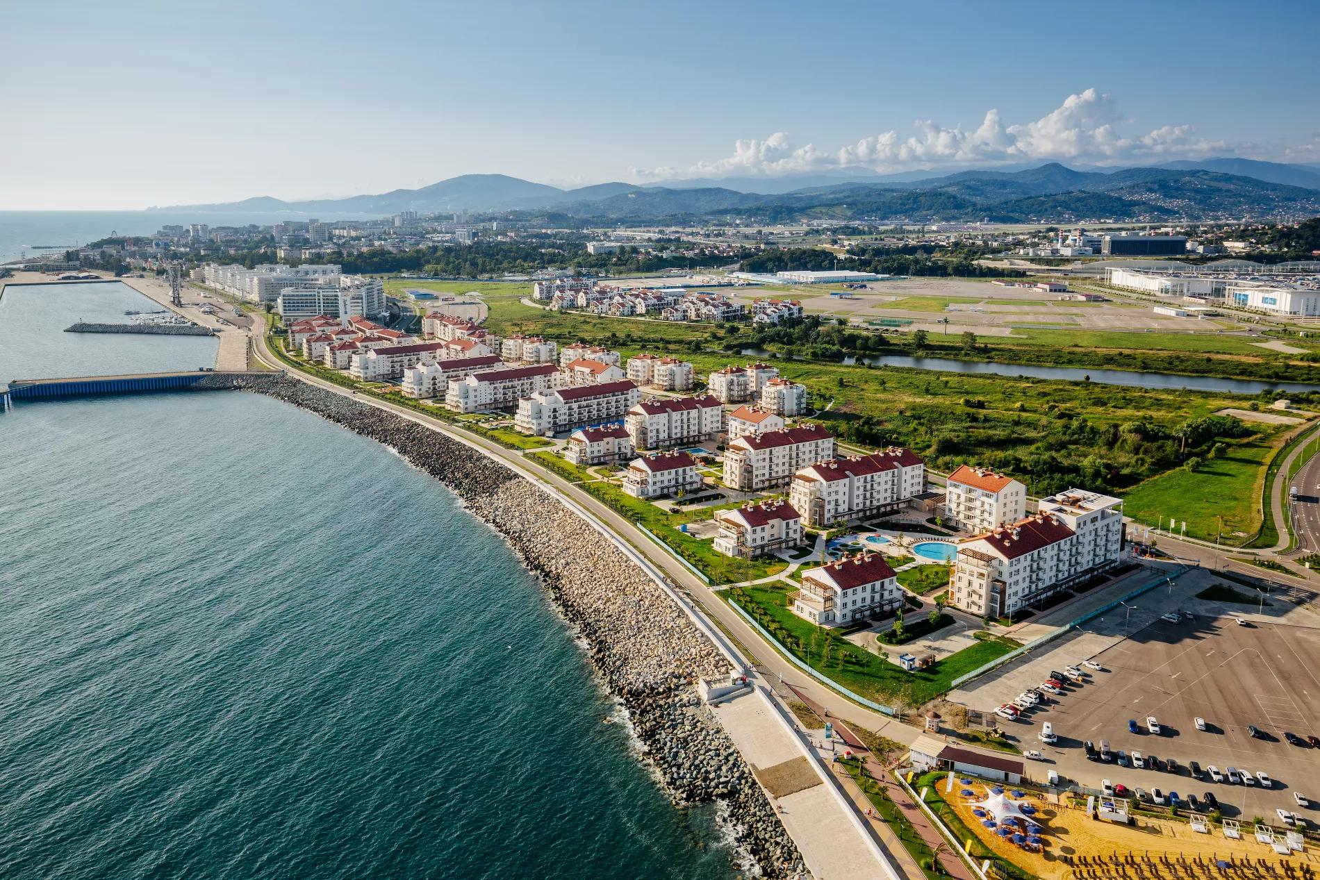 Апартаменты «Альфа Сириус» расположены в четырех кварталах: Морской, Заповедный, Парковый и Прибрежный. Это охраняемые территории с тропическими растениями и зелеными газонами, прогулочными аллеями, несколькими подогреваемыми бассейнами, детскими и спортивными площадками. Сейчас гостям доступны более тысячи апартаментов у береговой линии с кухнями, бытовой техникой и мебелью.