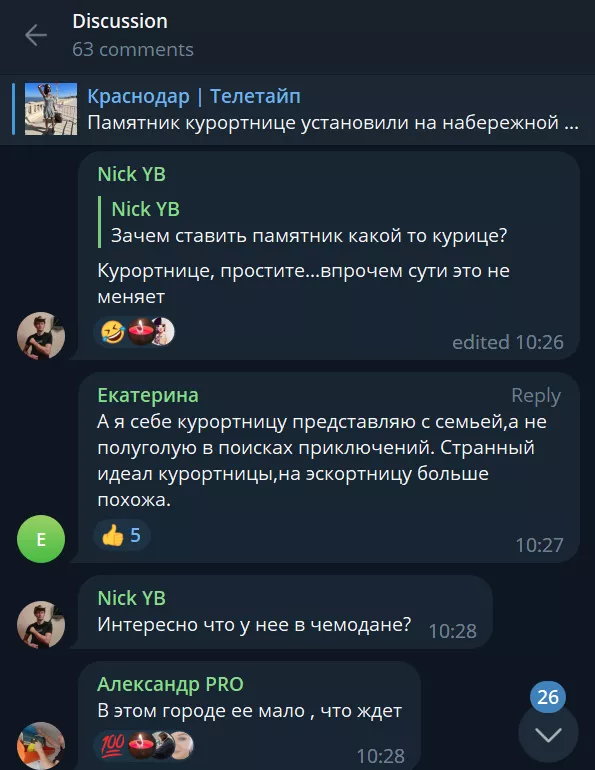 Мнения разделились иначе под постом в одном из пабликов Краснодара. Его авторы задали тон обсуждения описанием: «Курортница прекрасна и счастлива — она без мужа, без детей, на каблуках и готова к увлекательным приключениям».
